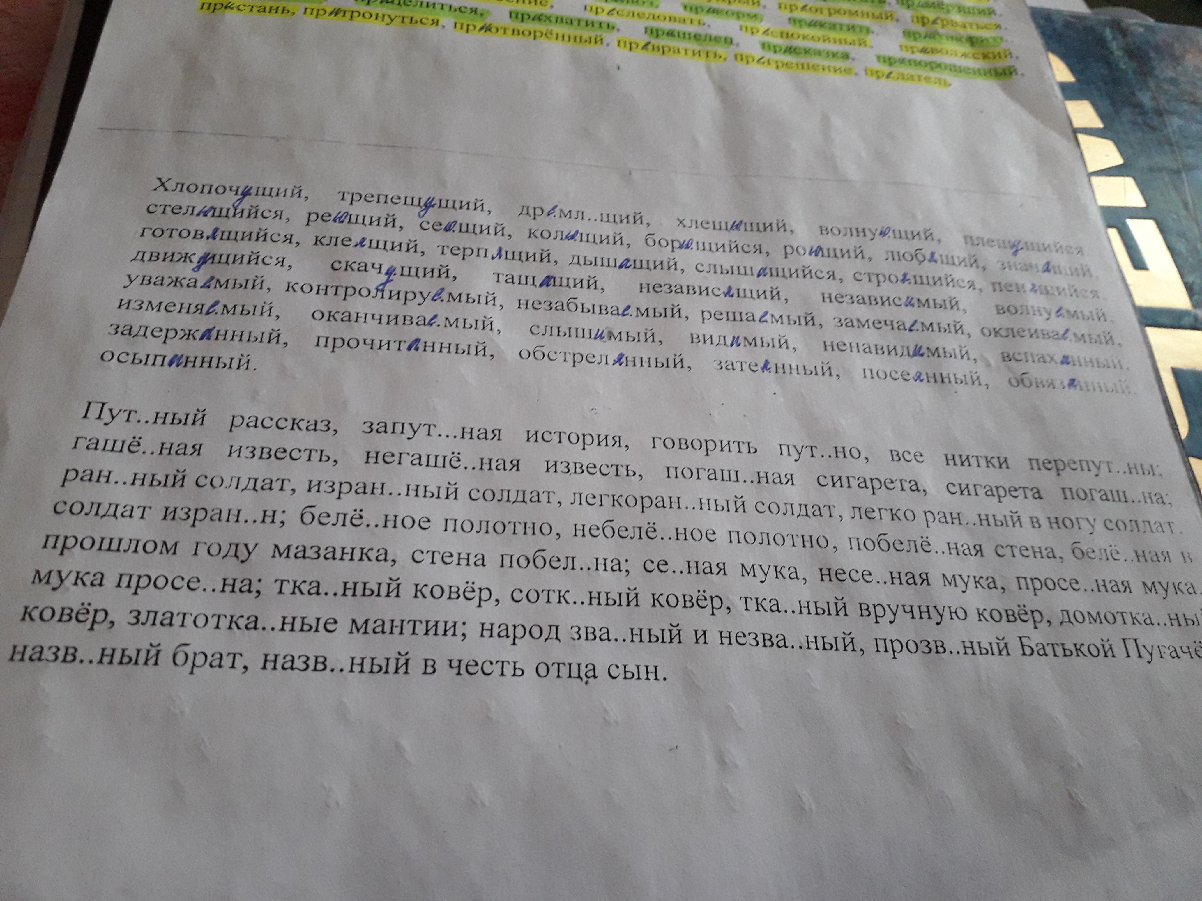 путанный рассказ, запутанная история, говорить путанно, нитки перепутаны, гашёная известь, негашённая известь, погашенная сигарета, сигарета погашена, раненый солдат, израненный солдат, легкораненый солдат, легко раненный в ногу солдат, солдат изранен, белёное полотно, небелённое полотно, побелённая стена, белёная в прошлом году мазанка, стена побелена, сеяная мука, несеянная мука, просеянная мука, мука просеяна, тканный ковёр, сотканый ковёр, тканный вручную ковёр, домотканный ковёр, златотканные мантии, народ званый и незванный, прозванный Батькой Пугачёв, названый брат, названный в честь отца сын