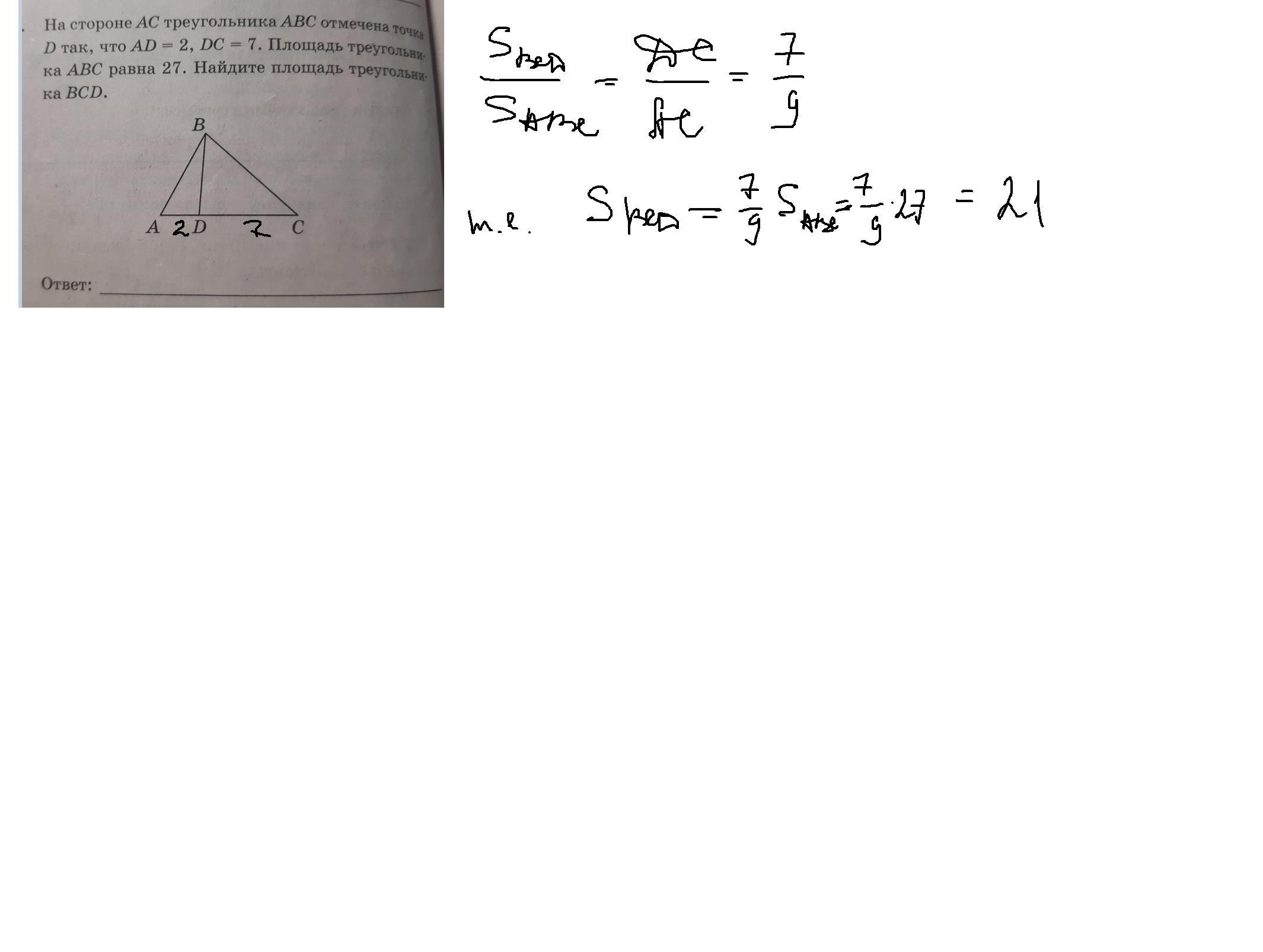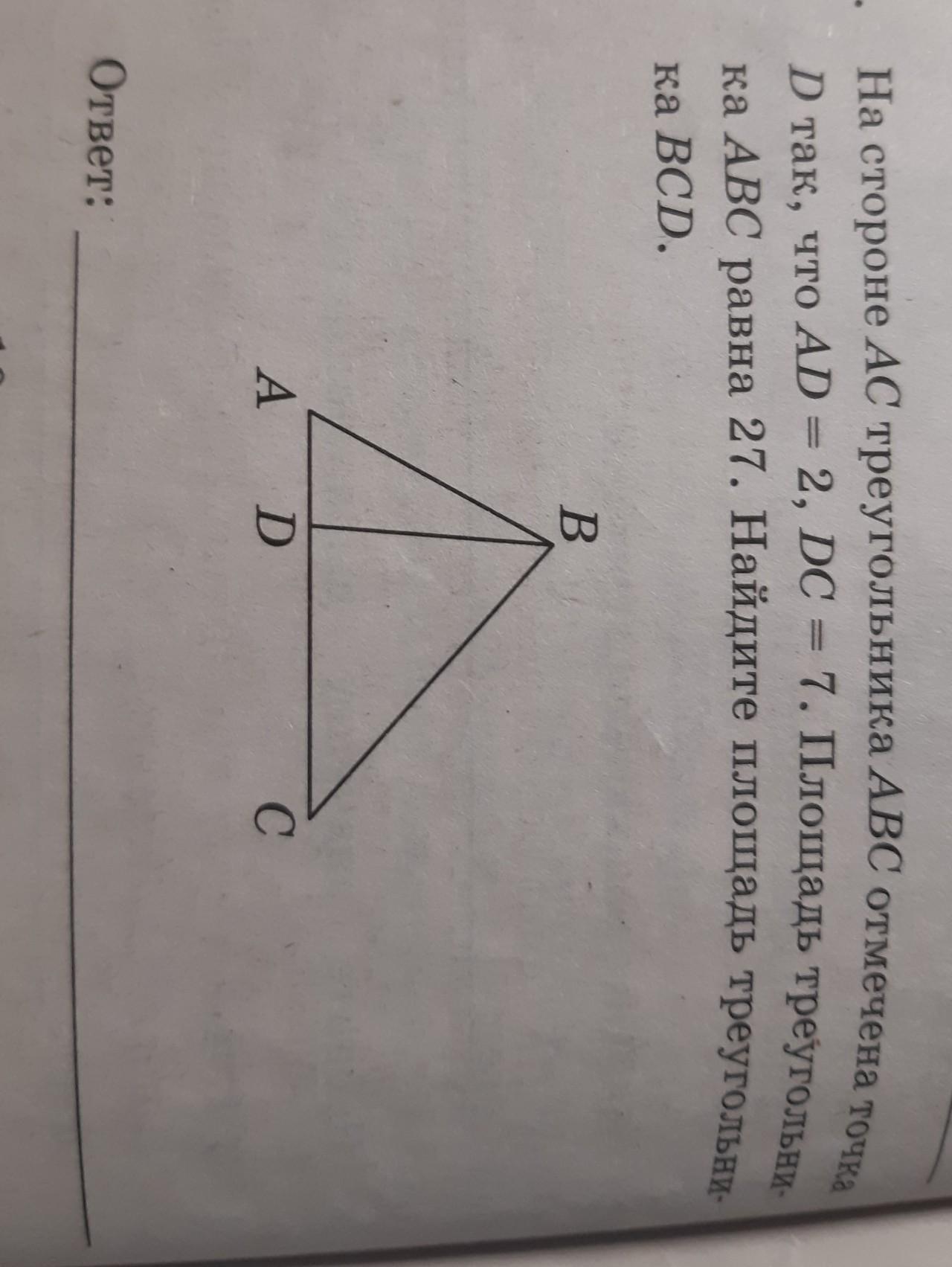 Из известной площади h=2S/a=2*27/9=6 ед. Тогда площадь DBC - 7*6/2=21 ед².