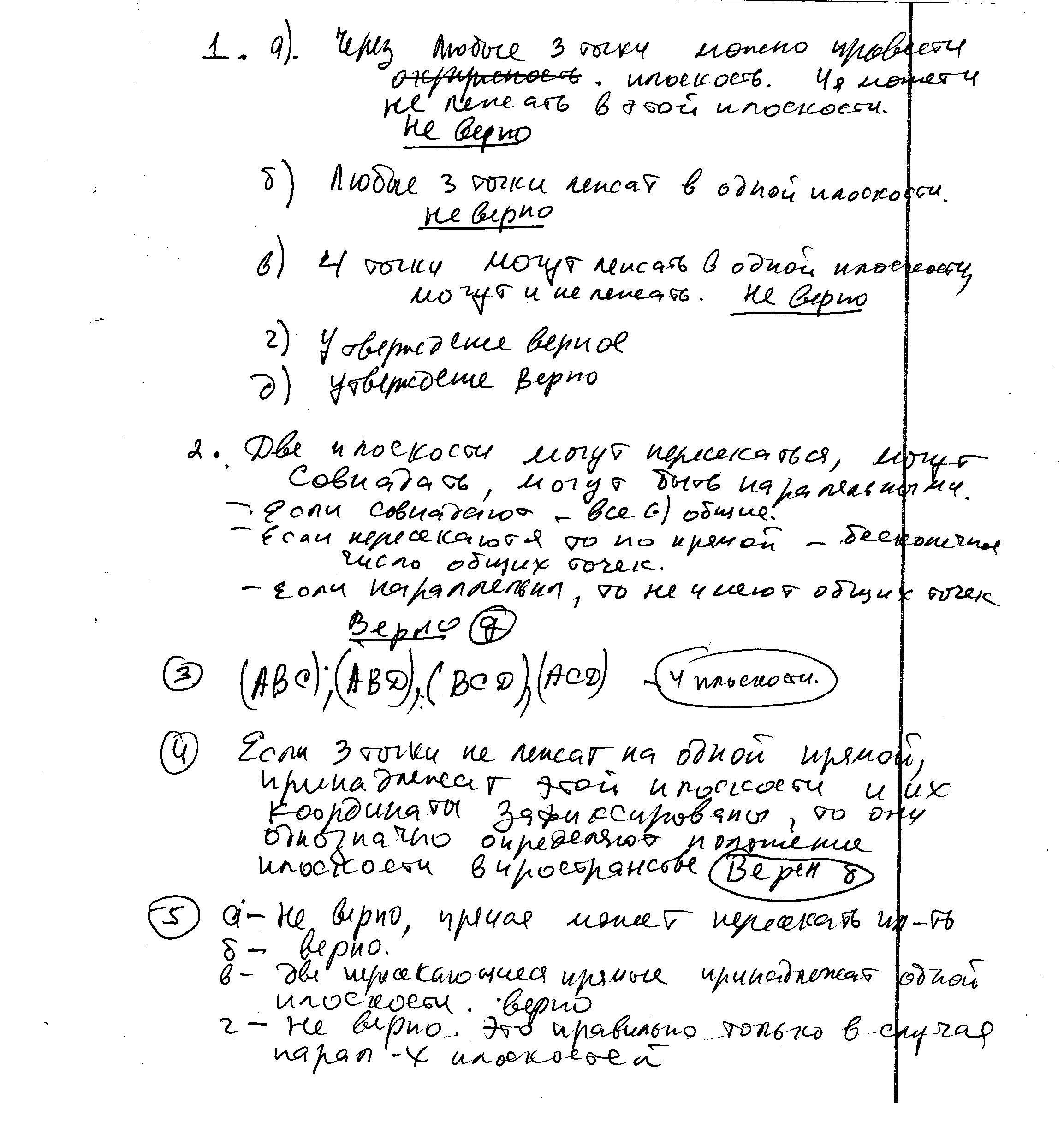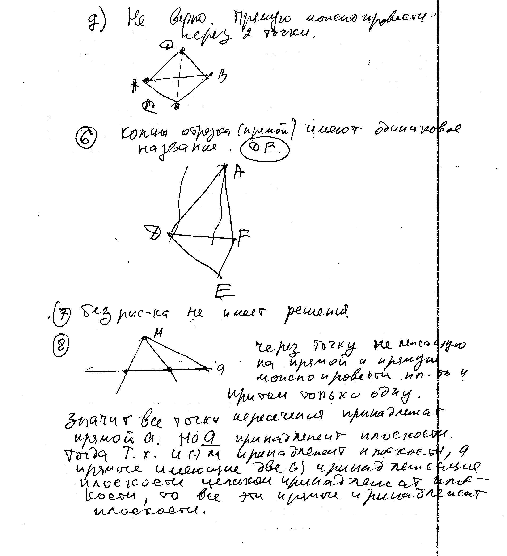 а) Если одна точка прямой лежит в плоскости, то все точки прямой лежат в этой плоскости; б) через прямую и не лежащую на ней точку проходит плоскость, и притом только одна; в) через две пересекающиеся прямые плоскость провести нельзя; г) любые две плоскости не имеют общих точек; д) если четыре точки не лежат в одной плоскости, то какие-нибудь три из них лежат на одной прямой.