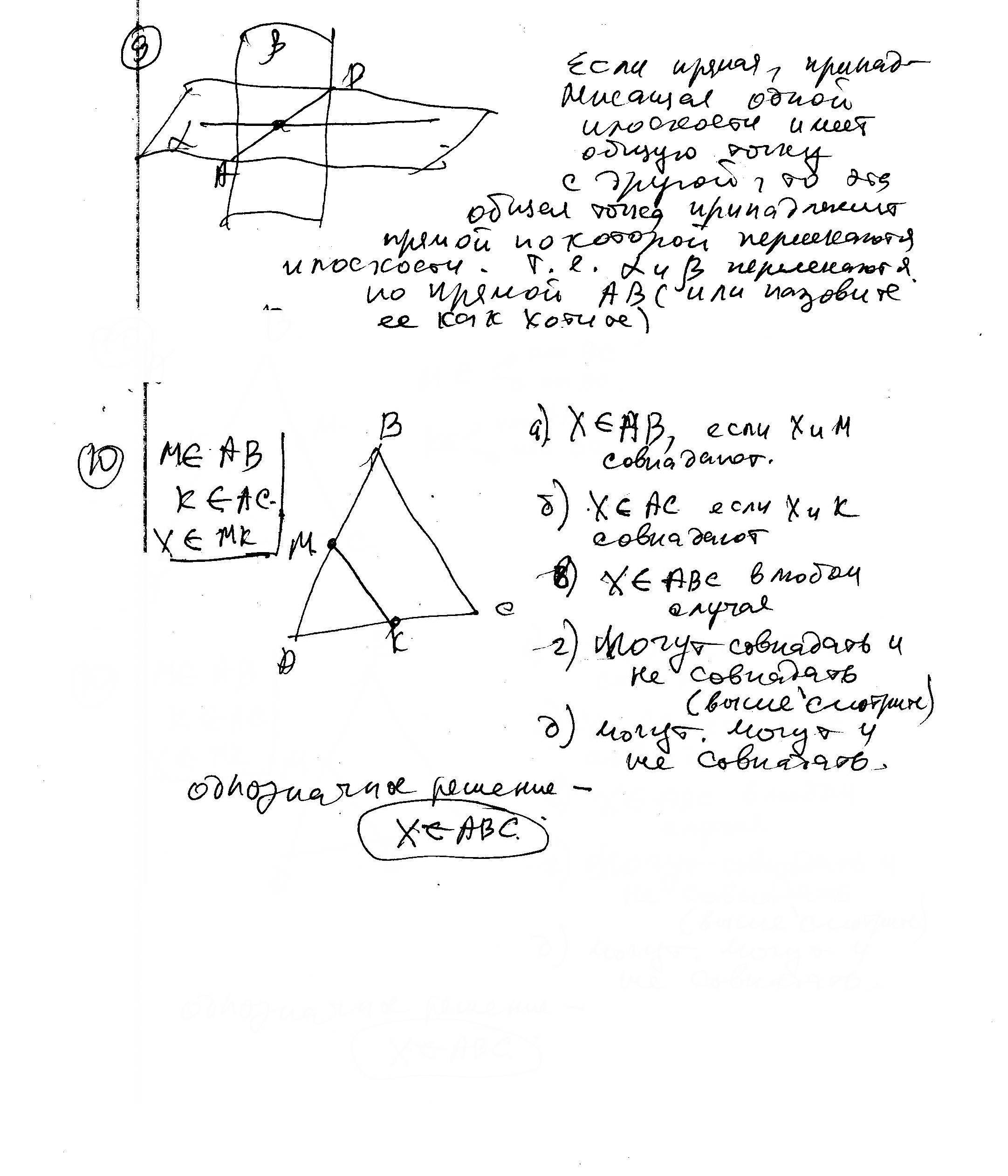 а) X € AB; б) X € AC; в) X € ABC; г) точки Х и М совпадают; д) точки Х и К совпадают.