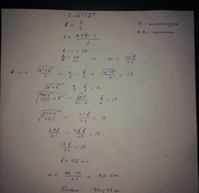 Найти катеты прямоугольного треугольника, если их отношение равно 20 к 21, а разница между радиусами описанного и вписанного кал равна 17 см.