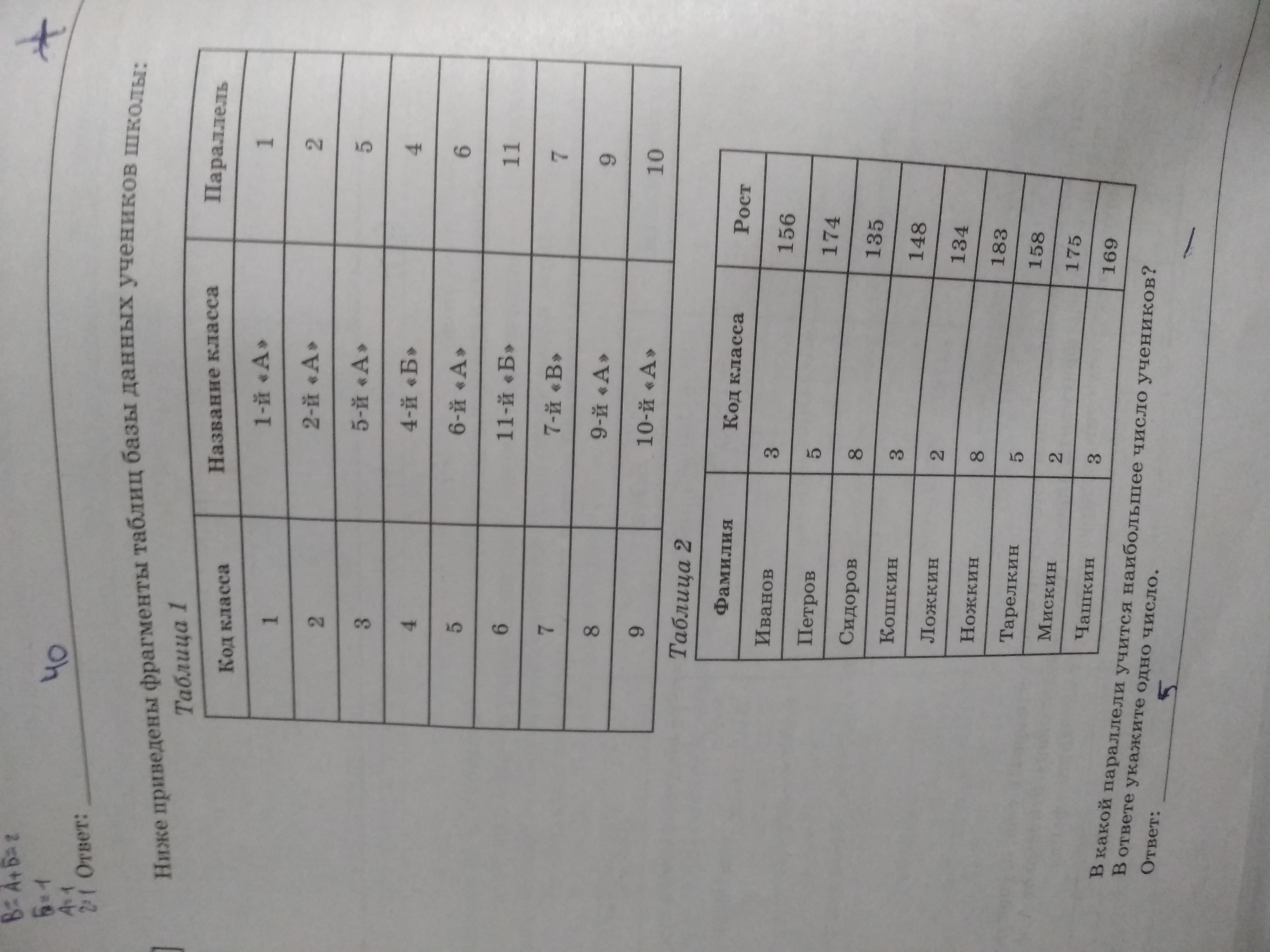 у 5 параллели код=3,теперь смотрим на 2 таблицу. Там указаны фамилии с разными кодами(=параллелями),так как кода 3 там больше всего,поэтому в 5 параллели больше всего учеников.