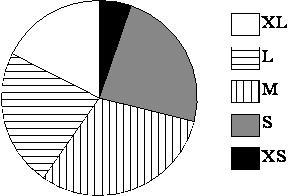 В магазине продаются футболки пяти размеров: XS, S, M, L и XL. Данные по продажам в январе представлены на круговой диаграмме.