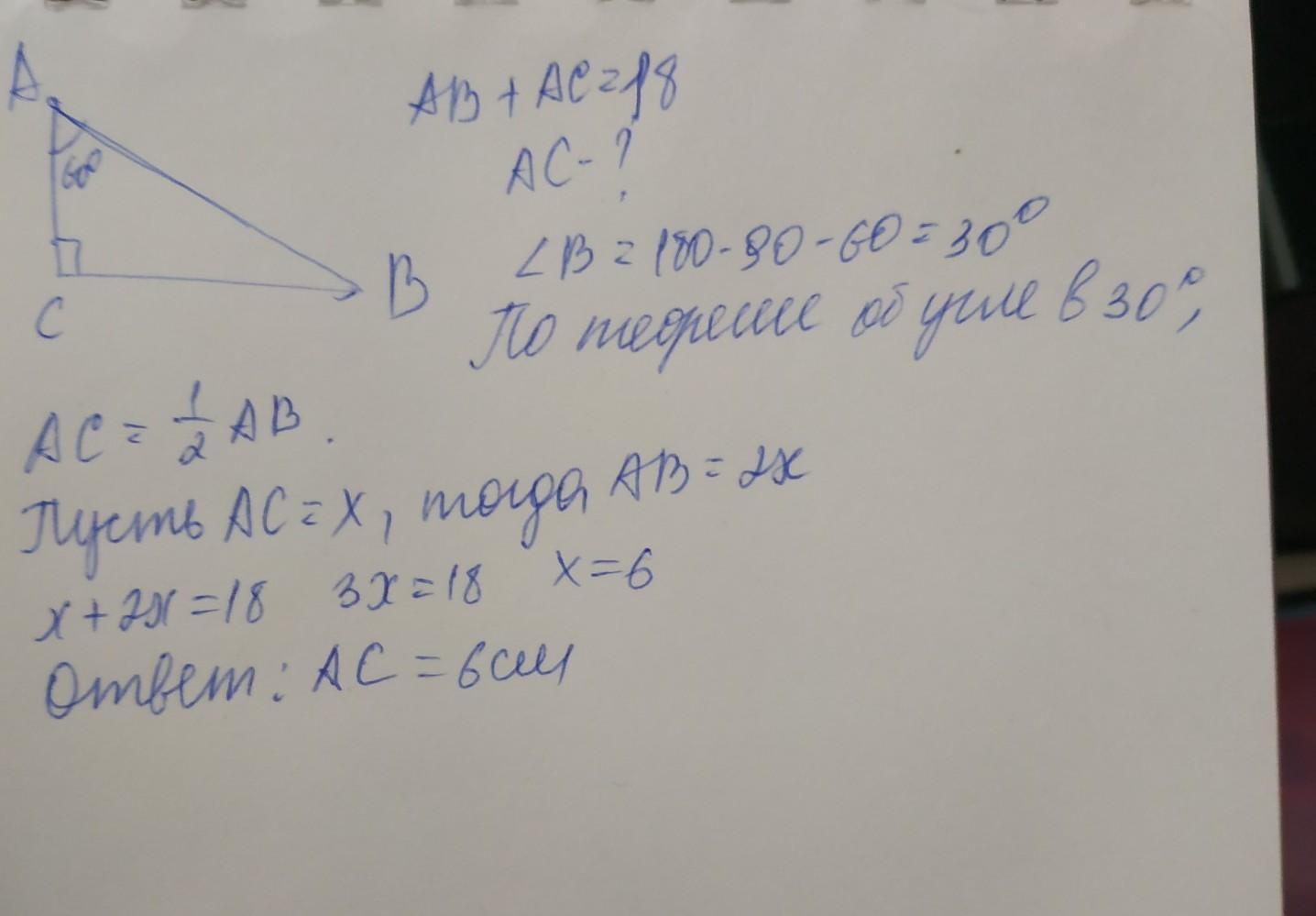 Один из углов прямоугольного прямоугольника 60 градусов, а сумма гипотенузы и меньшего катета равен 18 см. Найдите гипотенузу и меньший катет. ПОЖАЛУЙСТА ПОМОГИИИТЕЕЕ