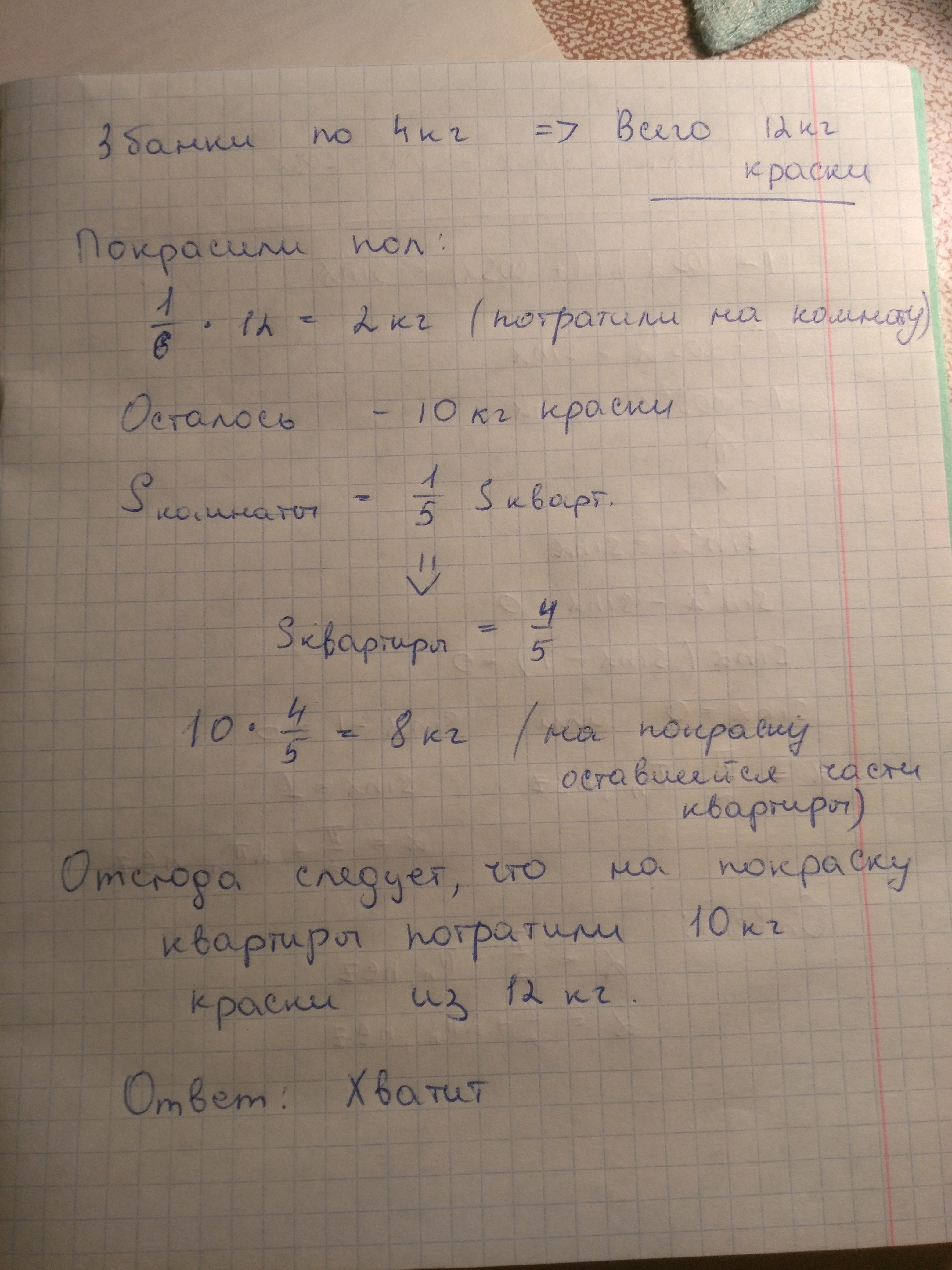 Купили 3 банки лака по 4 кг в каждой.Покрасив пол комнаты,истратили 1/6 часть лака.Площадь комнаты составляет 1/5 площади всей квартиры.Хватит ли купленного лака для покрытия пола всей квартиры?