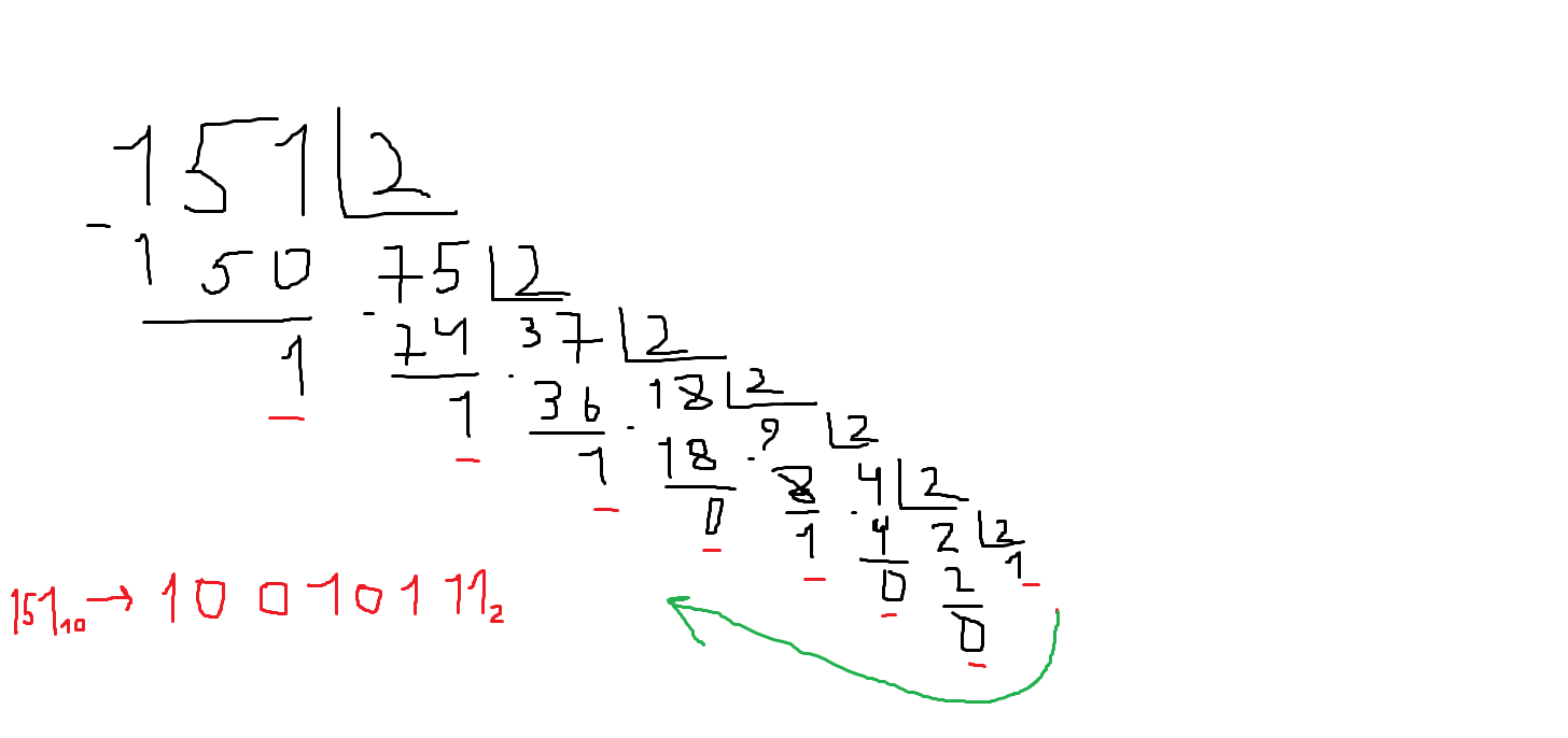 151 самая близкая степень числа 2 - это 128 (2^7), значит ставим 1,(151-128=23)следующее число 64 (2^6), из 23 нельзя вычесть 64, значит ставим 0, далее 32 (2^5) тоже самое : из 23 не вычитаем 32, дальше 16(2^4) из 23 можно вычесть 16, значит ставим 1 и так далее до 2^0.