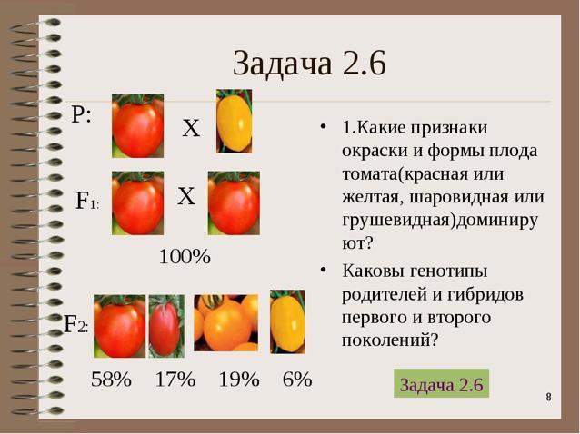 Доминирует желтая окраска и шарообразная форма. Генотип родителей АА - красная груше образная и Аа- желтая шарообразная. Гибриды 1ого порядка имеют АА, Аа, а 2 ого порядка аА и аа