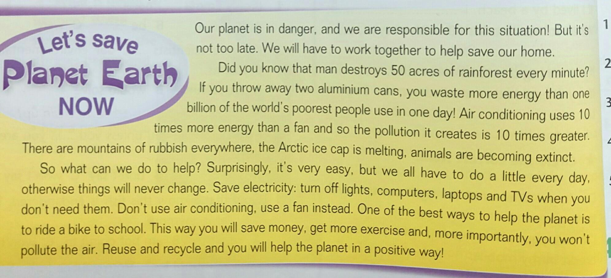 Наша планета в опасности, и мы несем ответственность за эту ситуацию не слишком поздно. Мы должны будем работать вместе, чтобы помочь спасти наш дом. Знаете ли вы, что человек уничтожает 50 акров тропического леса каждую минуту? Если вы выбрасываете две алюминиевые банки, вы тратите больше энергии, чем один миллиард самых бедных людей в мире, которые используют за один день. Кондиционер потребляет в 10 раз больше энергии, чем вентилятор, и поэтому загрязнение окружающей среды созидание в 10 раз больше. Горы нульбиша повсюду, шапка Арктики длится, животные вымирают. Так что мы можем сделать, чтобы помочь? Удивительно. это очень легко, но мы все должны делать немного каждый день, иначе вещи никогда не изменятся. Экономьте электричество, выключите свет. компьютеры, ноутбуки не нуждаются в них. Не используйте кондиционер, вместо этого используйте вентилятор. Один из лучших ездить на велосипеде в школу. Таким образом вы сэкономите деньги, получите больше упражнений и, пожалуй, будете загрязнять воздух. Повторно используйте и утилизируйте, и вы будете помогать планете в позитивном ключе и телевизорах, когда вам будет важно помочь планете. ты не будешь