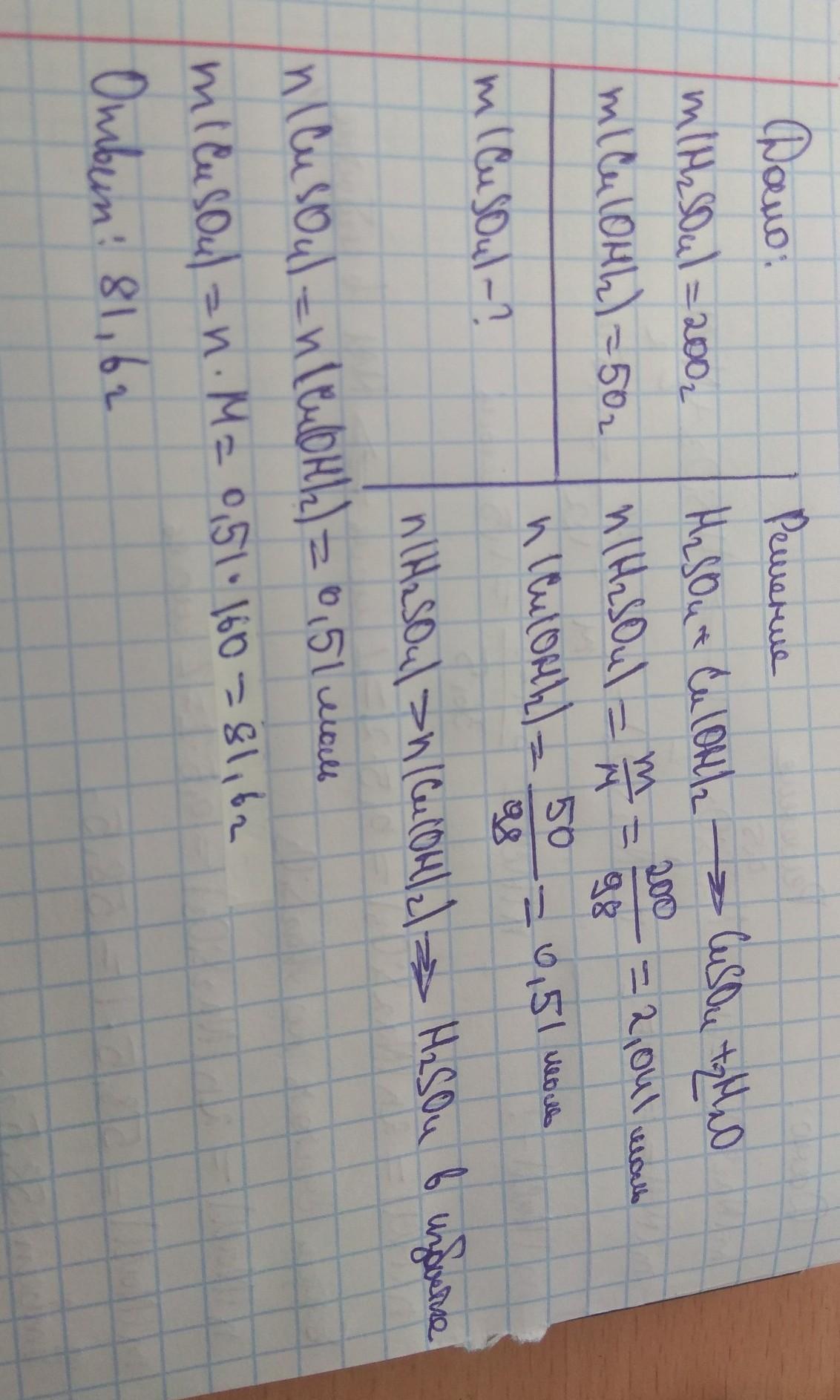 Вычислите массу соли полученной при взаимодействии 200 грамм серной кислоты с гидроксидом меди (2 валентны)массой 50 грамм