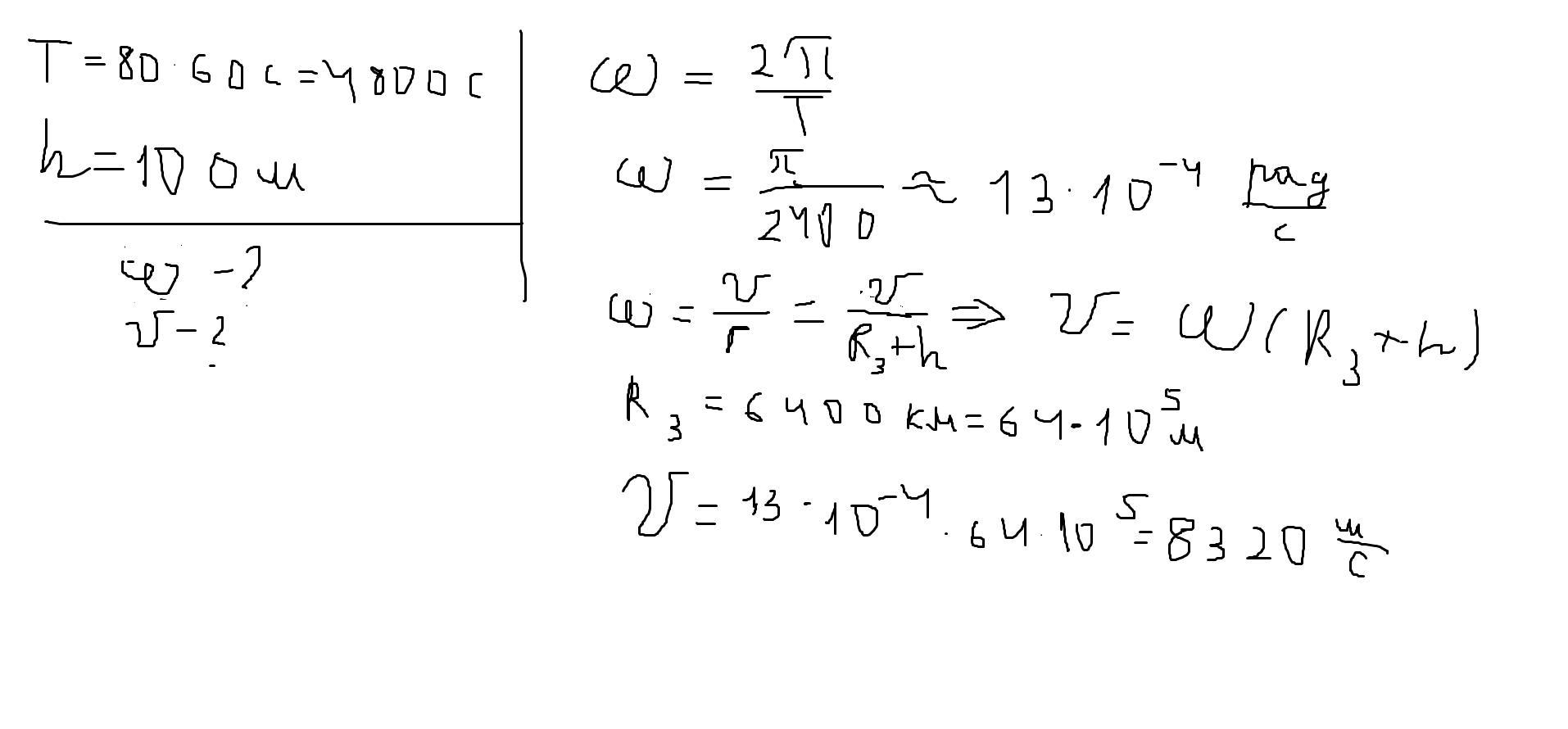 найти угловую скорость искусственного спутника Земли, движущегося по круговой орбите с периодом вращения Т=80 мин. Какова линейная скорость движения этого искусственного спутника, если известно, что его орбита расположена на расстоянии ℎ=100 км от поверхности Земли?