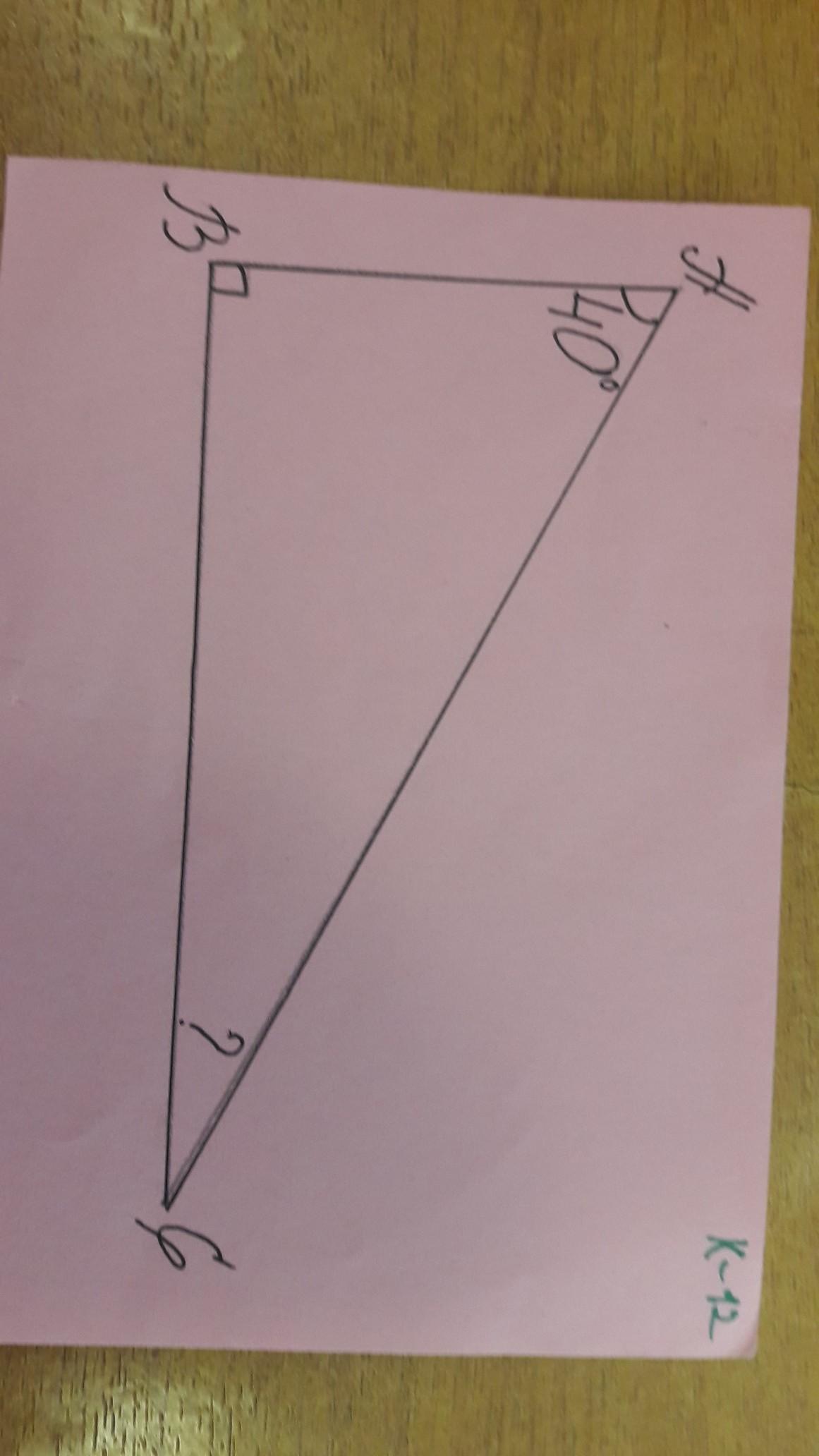 Сумма всех углов треугольника равна 180°,угол B=90°, уголA=40°. Угол C= 180°-(A+B)=180°-120°=60°