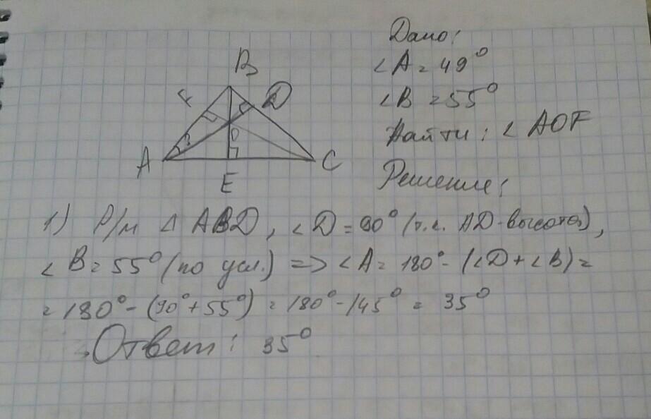 в треугольнике abc угол a равен 49 градусов угол b 55 градусов ad be cf высоты пересикающие в точке О .найдите угол aof