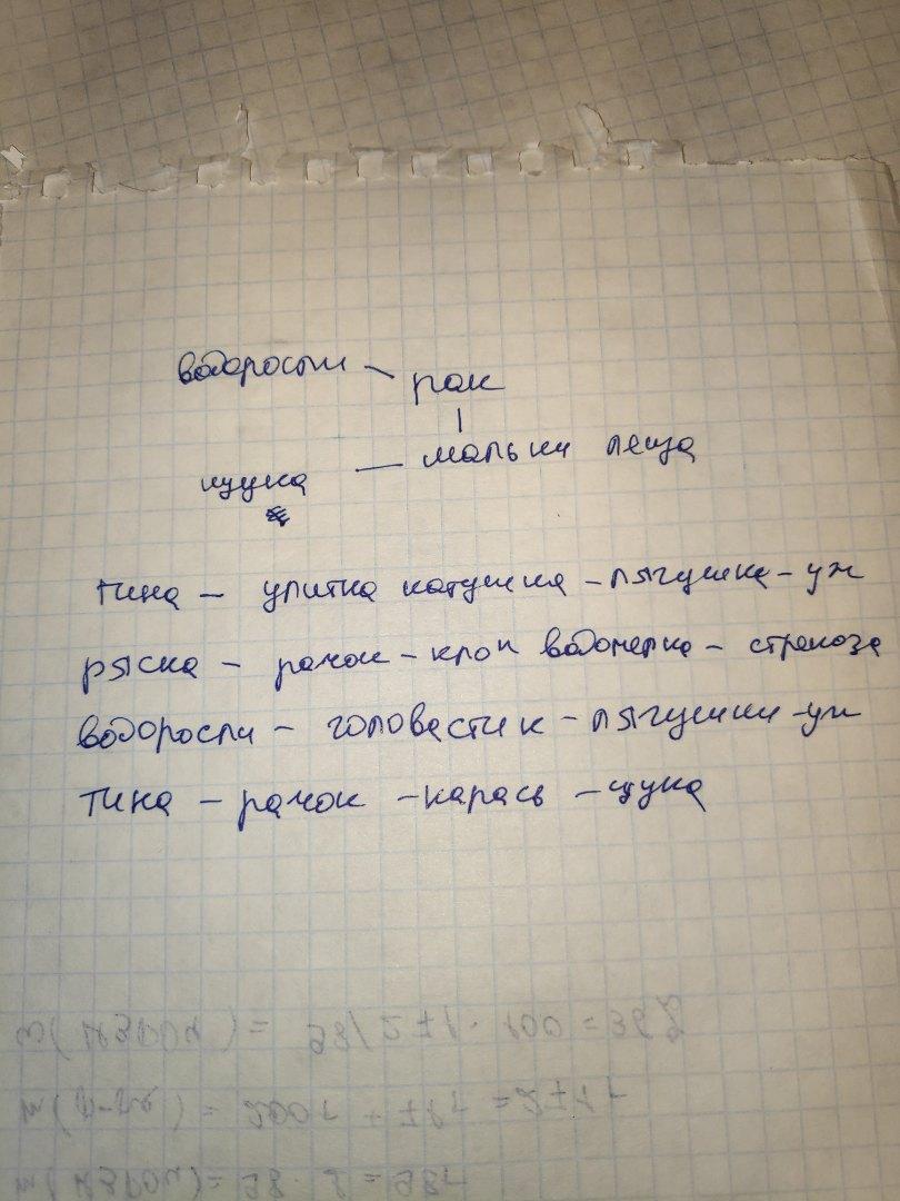 Животные : водоросли придонные, тина на поверхности воды , ряска, кувшинка, рак, карась , лягушка, клоп водомерка, улитка- катушка, щука, мальки леща, икра лягушки , уж, стрекоза