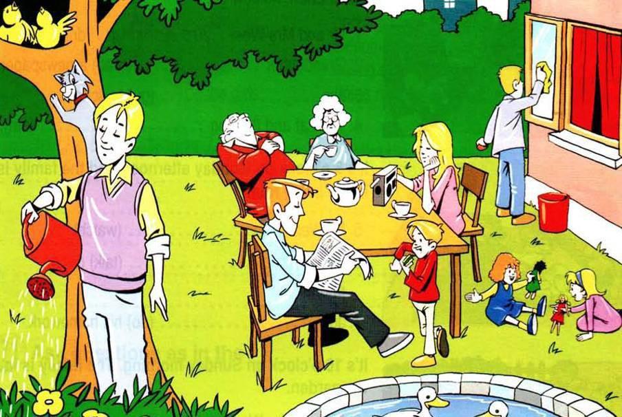 This is a picture of the family sitting in the garden.The father is watering yellow flowers.The little girls are sitting on the grass and playing dolls.The granny is drinking tea and the drandad is sleeping.