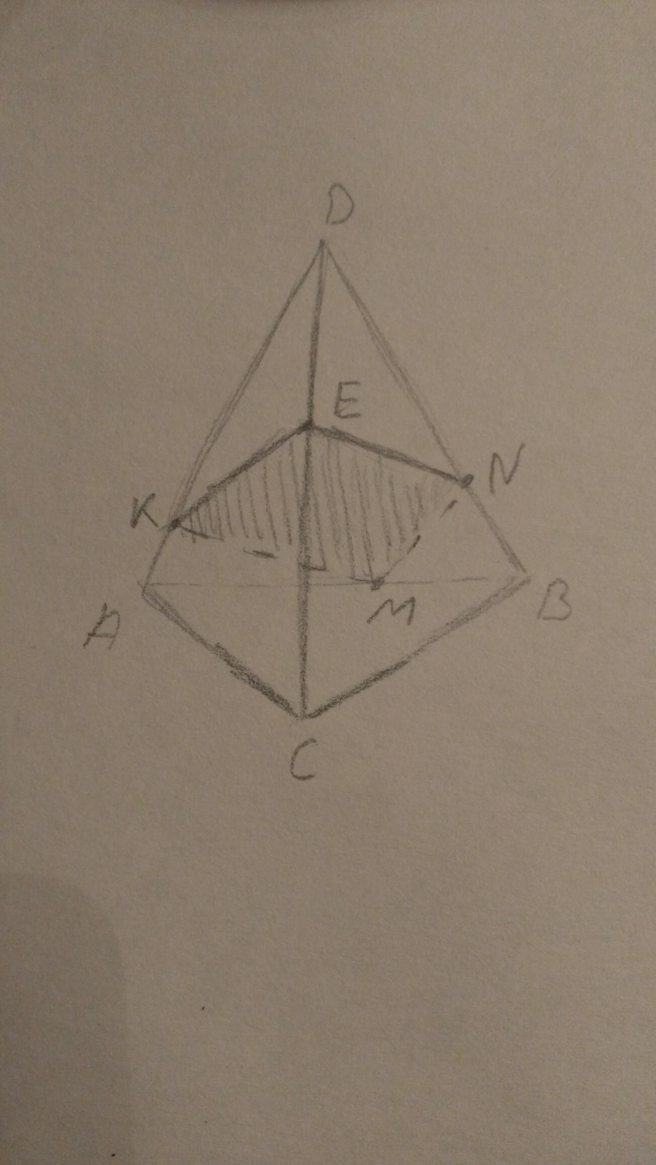 Рисуем тетраэдр. Отмечаем указанные точки на ребрах. Соединяем К и Е, К и М. Затем проводим отрезок ЕN, параллельный КМ. КЕ, параллельный MN.