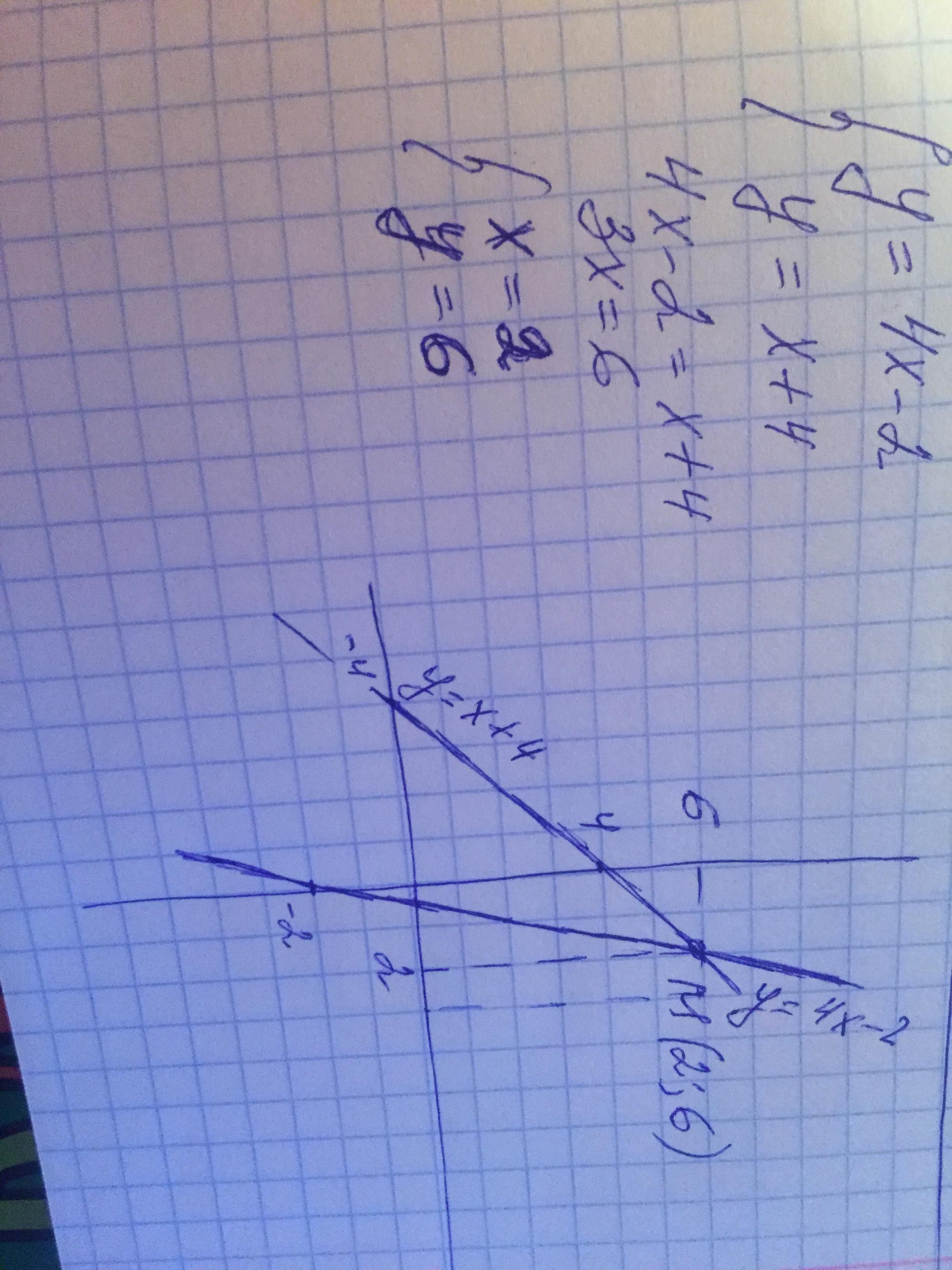 [tex]left { {{y=4x-2}atop{y=x+4}} right. \4x-2=x+4\3x=6\x=2\y=6\М(2;6)[]