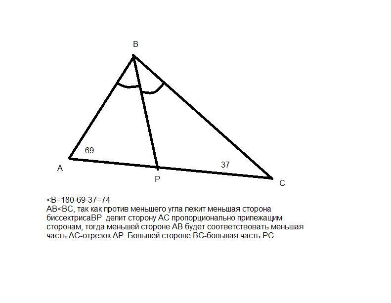 В треугольнике ABC угол с равен 37 угол a равен 69 BP биссектриса треугольника доказать что AP меньше чем PC