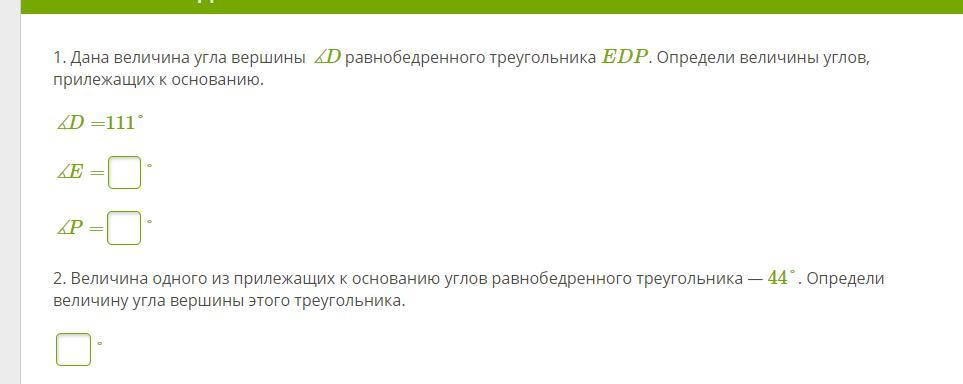 Так. Это очень простая задача! Мы знаем, что треугольник EDP - равнобедренный, а вершина D = 111°. Этих данных достаточно, чтобы решить задачу. Так как В РАВНОБЕДРЕННОМ ТРЕУГОЛЬНИКЕ УГЛЫ У ОСНОВАНИЯ равны, то угол E = угол P = (180° - 111°) ÷ 2 = 69 ÷ 2 = 34,5°.