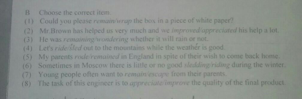 1. remain 2. appreciated 3. wondering 4.sled 5. rade 6. sledding 7. remain 8.improve :)