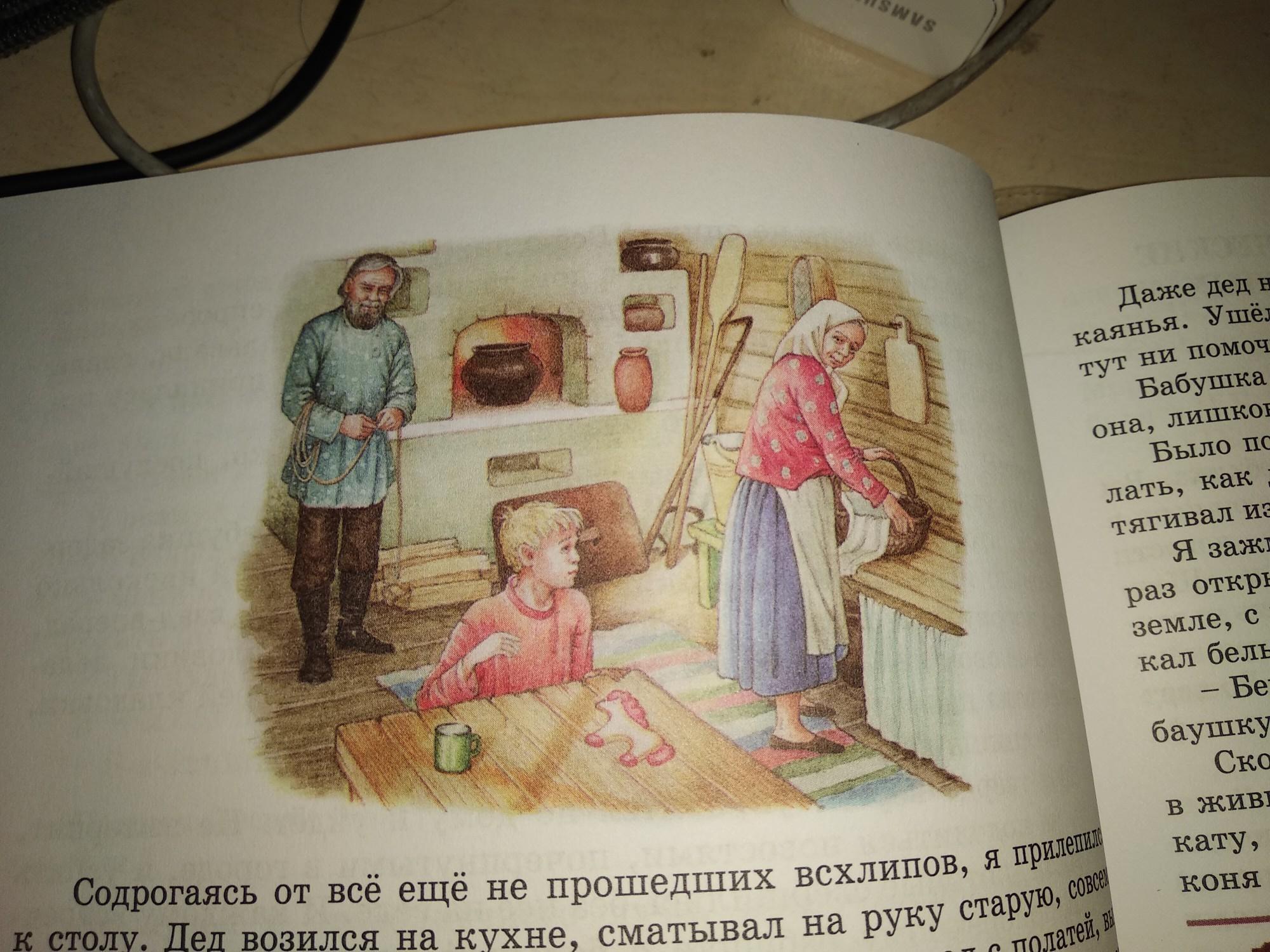 дед возился на кухне, сматывал на руку старую верёвку. мальчик сидел и глядел по сторонам. бабушка возилась с корзинай
