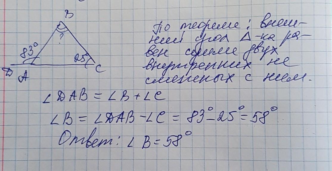 Дан треугольник ABC. Внешний угол при вершине А равен 83°. Внутренний угол при вершине С равен 25°. Чему равен внутренний угро при вершине В. Буду благодарен.