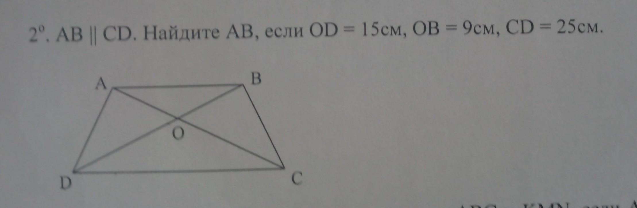 АВ параллельна CD, следовательно, треугольники АОВ и DOC подобны по двум углам (<O - вертикальные, <ODC=<ABO как внутренние накрест лежащие. Из подобия: коэффициент равен k = OB/OD = 9/15 = 3/5.