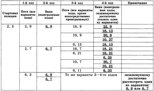 Таблица содержит все возможные варианты ходов первого игрока. Из неё видно, что при любом ходе первого игрока у второго имеется ход, приводящий к победе.