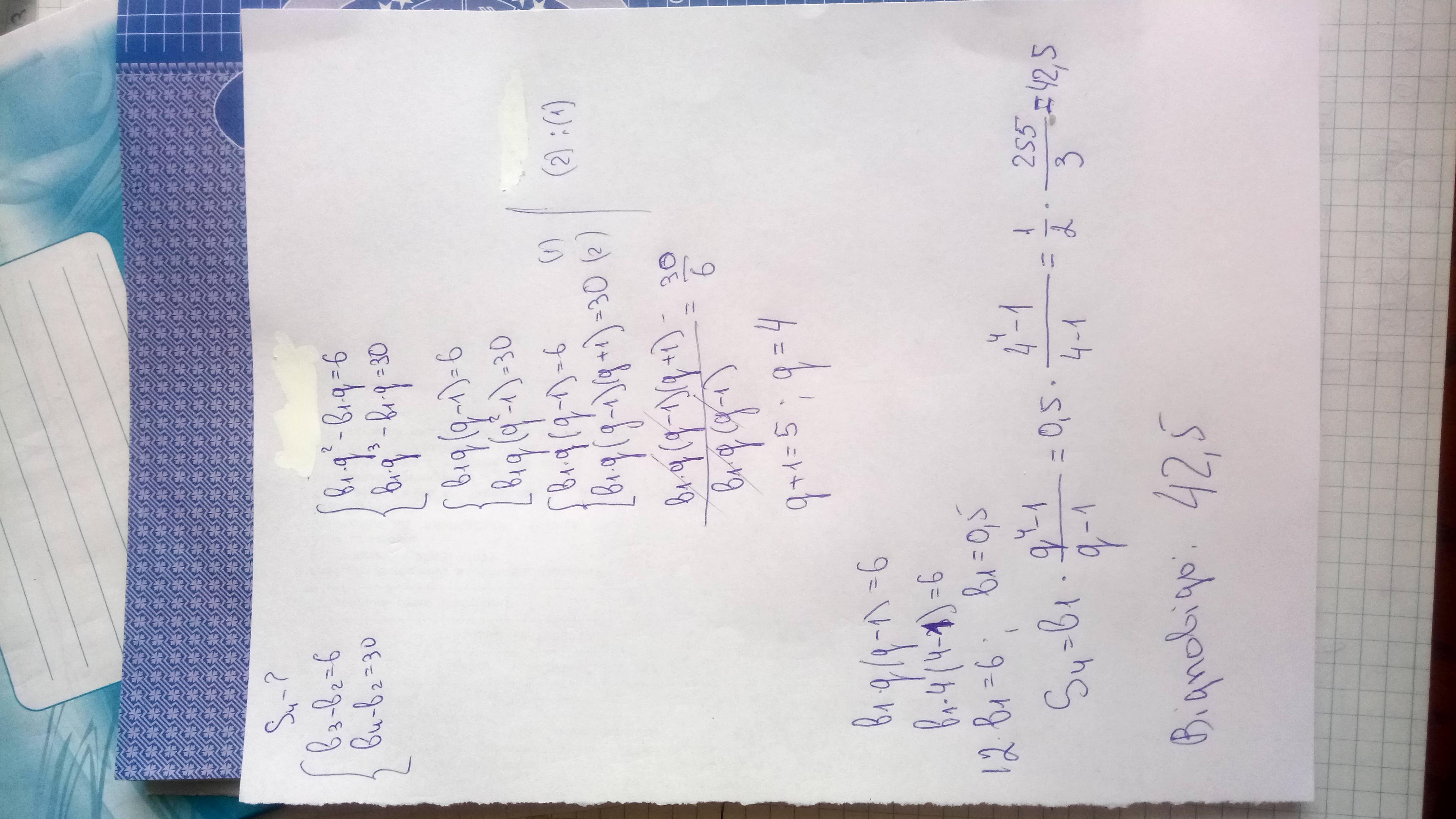 Знайти суму чотирьох перших членів геометричної прогресії (bn) якщо різниця третього та другого її членів дорівнює 6, а різниця четвертого та другого членів дорівнює 30