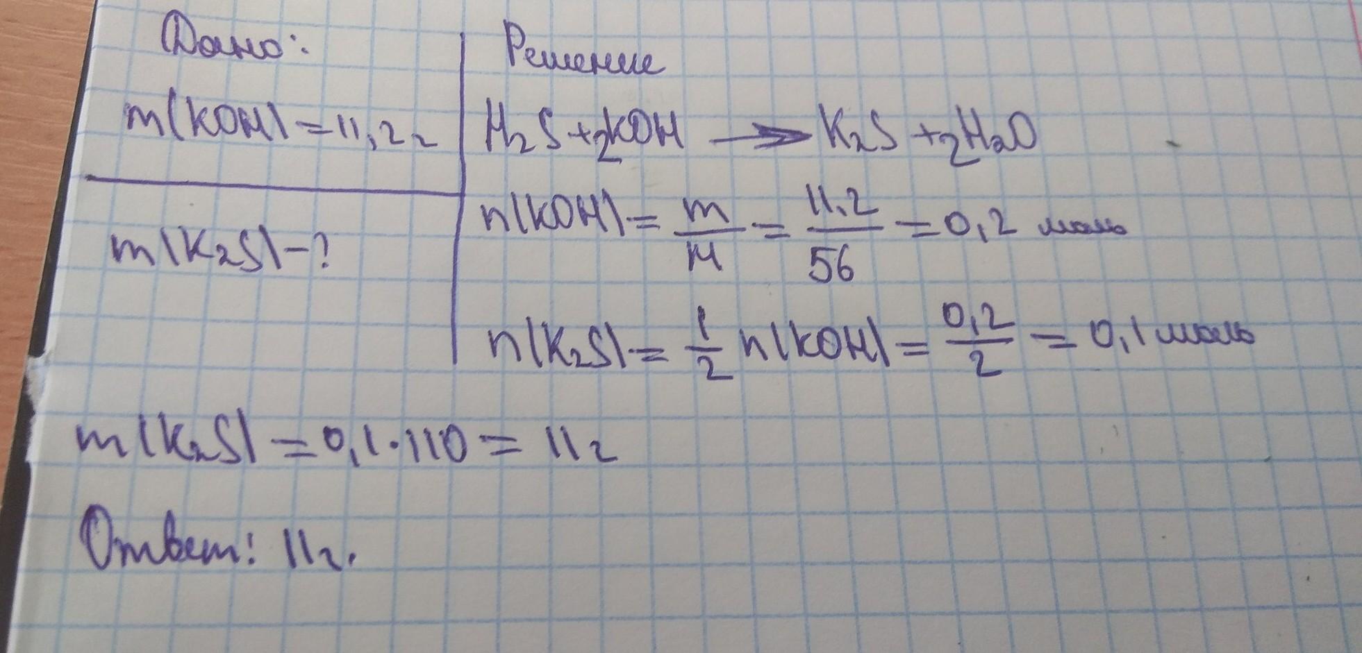 Рассчитать массу соли, полученной при взаимодействии сероводороной кислоты с гидроксидом калия массой 11,2 г