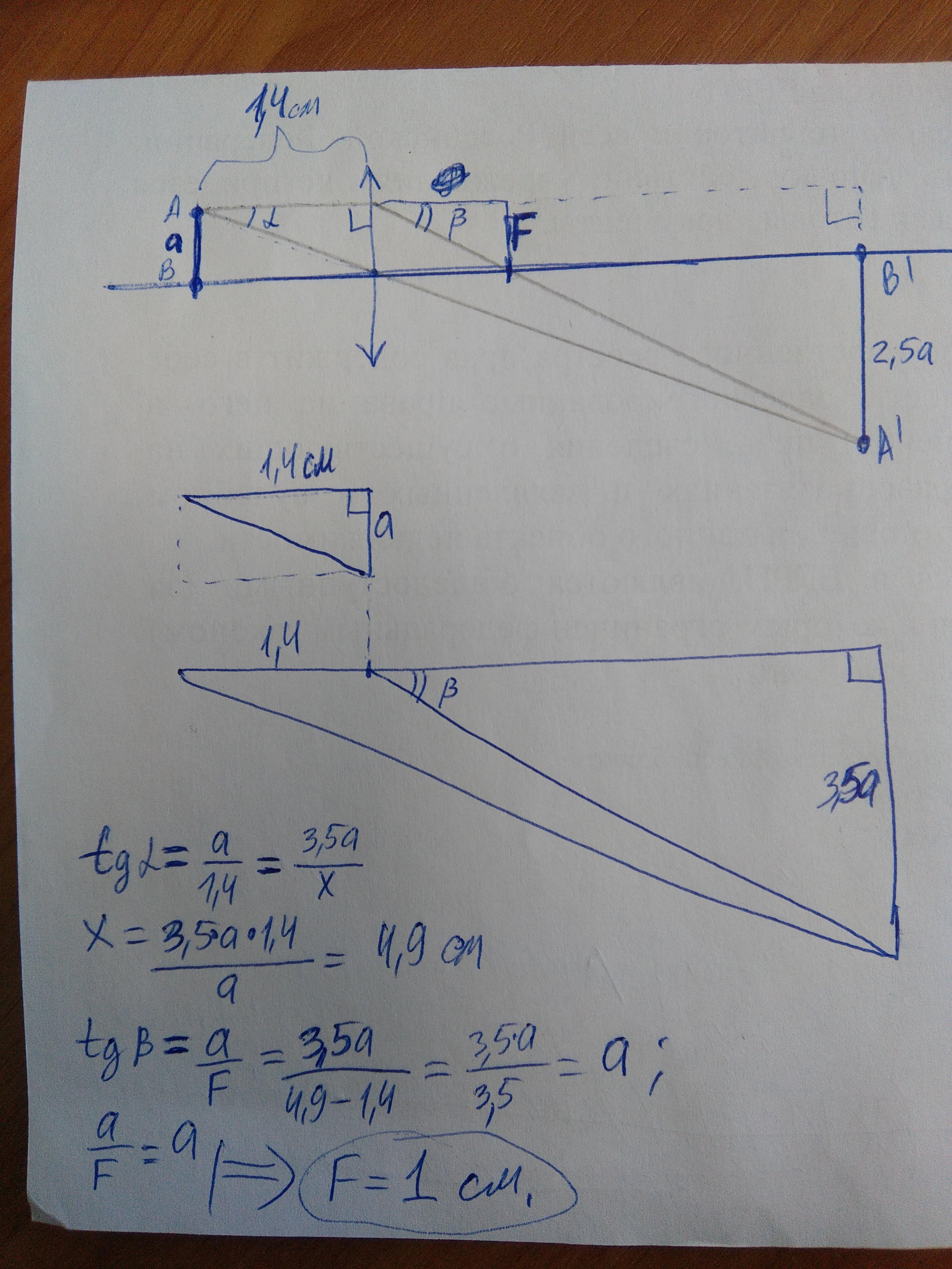 Тонкий стержень AB расположен перпендикулярно главной оптической оси тонкой собирающей линзы на расстоянии 1.4 см от нее. Один конец стержня находится на главной оптической оси. Изображение стержня, полученное на экране с помощью этой линзы, в 2.5 раза больше самого стержня. Определите фокусное расстояние линзы в см