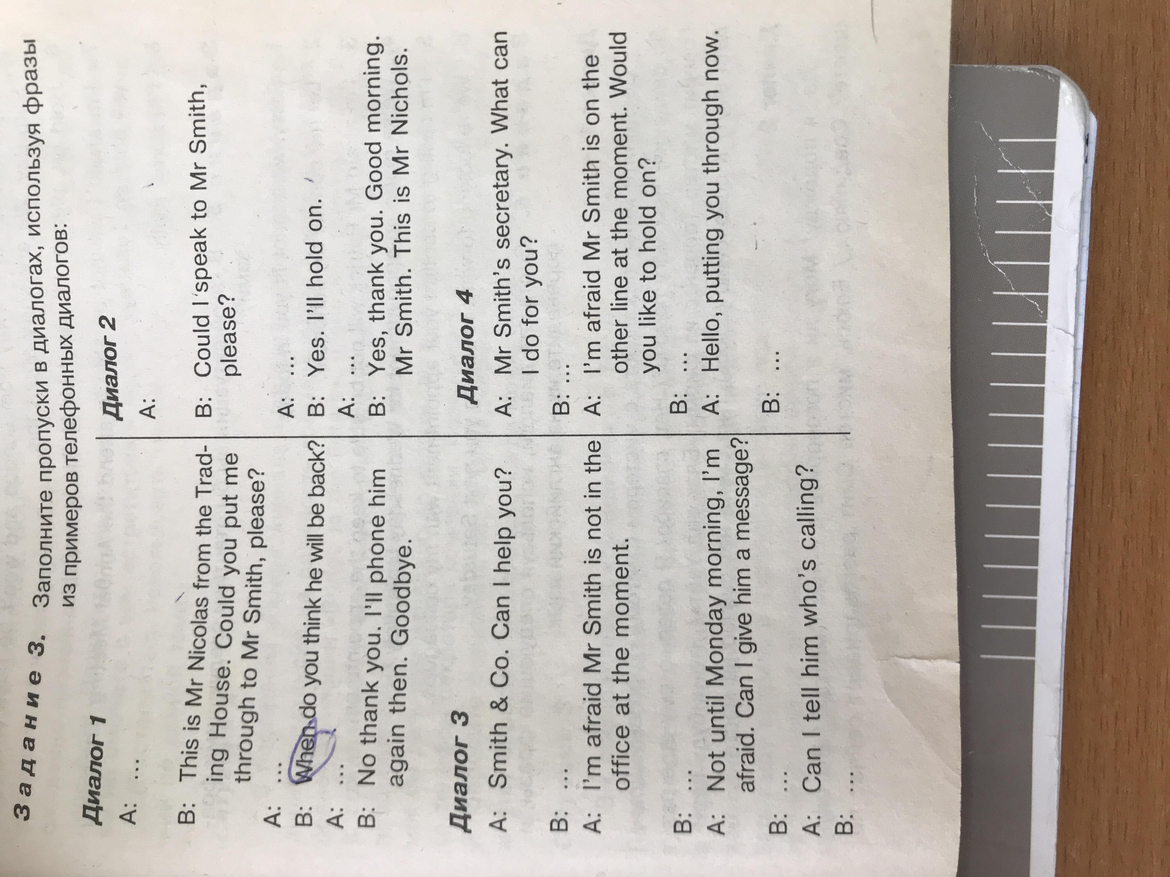 dialod 2 hello, i am looking for mr. Smith/ can you tell when he will be back in the office?/ no thank you?/ i am his friend mr Black