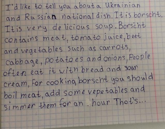 Я бы хотел рассказать вам об украинском и русском национальном блюде. Это борщ. Очень вкусный суп. Борщ содержит мясо, томатный сок, свеклу и овощи, такие как морковь, капусту, картофель и лук, люди часто едят его с хлебом и сметаной. Для приготовления борща следует варить мясо, добавлять овощи и варить их в течение часа...