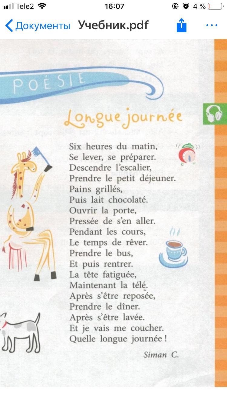 Шесть часов утра, Вставай, готовься. Спустись по лестнице, позавтракай. Поджаренный хлеб, затем шоколадное молоко. Откройте дверь, спешите уйти во время урока, время мечтать. Сядьте на автобус, а затем возвращайтесь. Уставшая голова, теперь телевизор. Отдохнув, поужинайте. После мытья.И я иду спать. Какой длинный день!