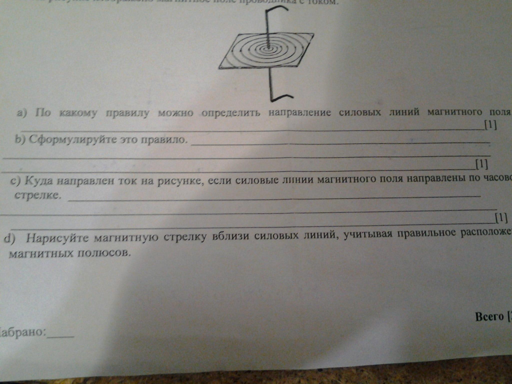 с)Куда направлен ток на рисунке,если силовые линии магнитного поля направлены по часовой стрелке.