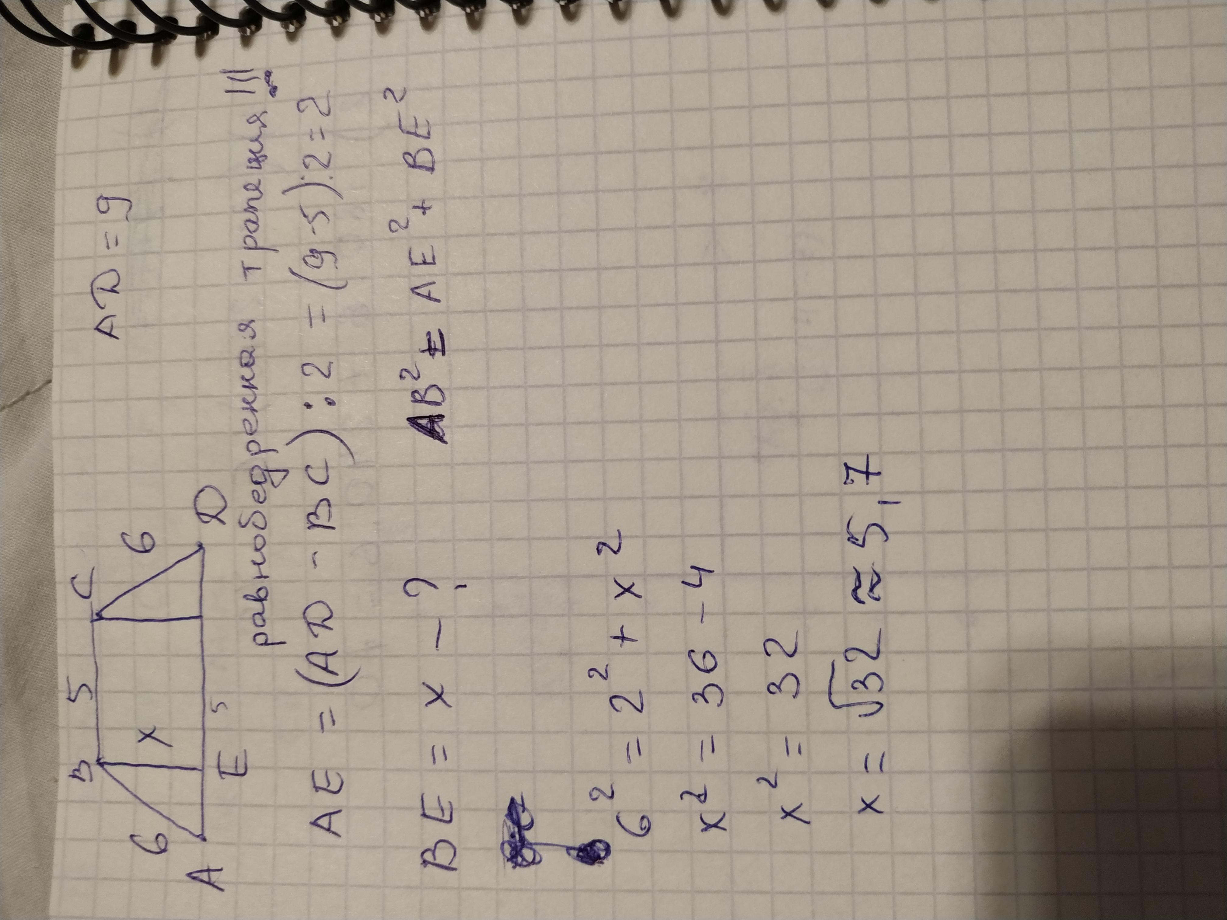 Т.к если мы проведём прямую такую же как и BE рядом со стороной CD, то получим треугольник схожий с треугольником AEB. Точку назовём ( где мы провели прямую рядом со стороной CD ) K, получится треугольник CKD. Известно, что BC=5 и промежуток ( снизу ) между треугольниками AEB и CKD будет также равен 5. Мы получили квадрат BEKC, в квадрате всё стороны равны, а значит, x=5 ( BE ). Также CK, EK будут равны 5.