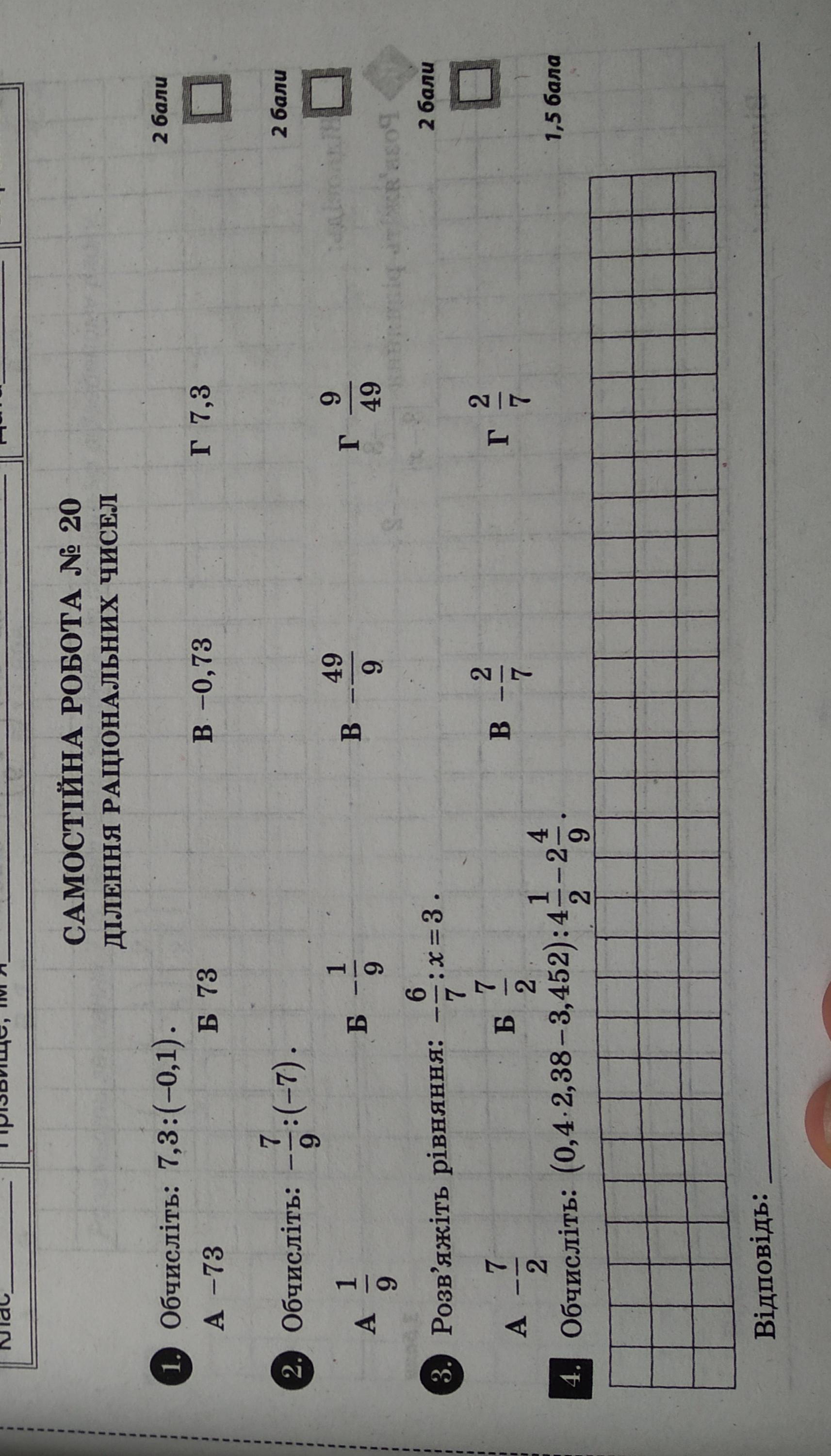 1. 7,3 : (-0,1) = 73 : (-1) = -73, Ответ: А