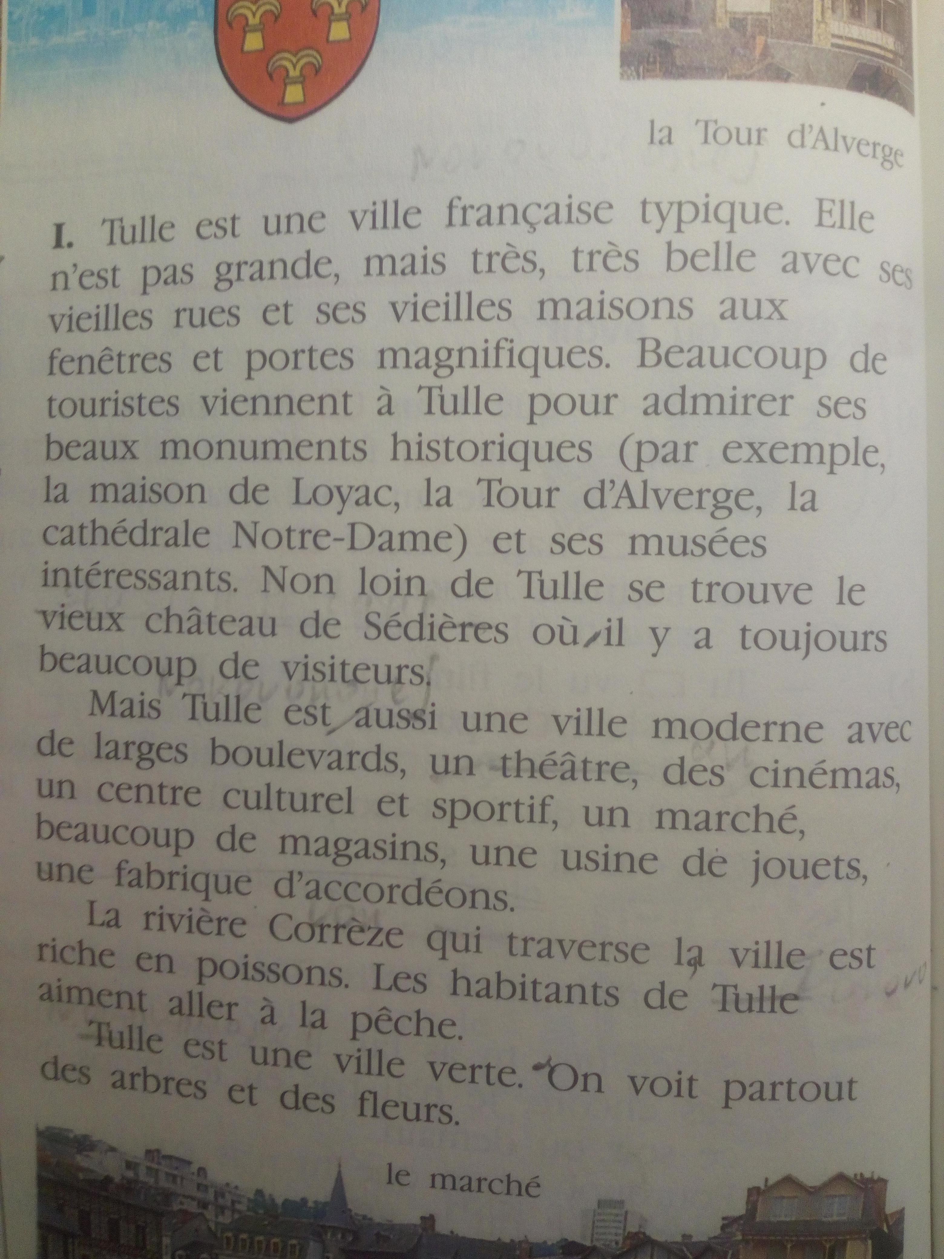 Тюль - типичный французский город. Он не большой, но очень, очень красивый со старыми улицами и старыми домами с красивыми окнами и дверями. Многие туристы приезжают в Тюль, чтобы полюбоваться его красивыми историческими памятниками (например, Дом Лояк, Башня Альверге, Собор Нотр-Дам) и его интересными музеями. Недалеко от Тюля находится старый замок Седьер, где всегда много посетителей. Но Тюль - это также современный город с широкими бульварами, театром, кинотеатрами, культурным и спортивным центром, рынком, множеством магазинов, фабрика игрушек, фабрика аккордеонов. Река Коррез, протекающая через город, богата рыбой. Жители Тулля любят ловить рыбу Тюль - зеленый город. Мы видим повсюду деревья и цветы.