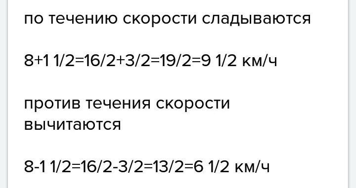 Найдите скорость лодки по течению реки и против течения если её собственная скорость 8 км ч а скорость течения реки одна целая 1/2 км ч