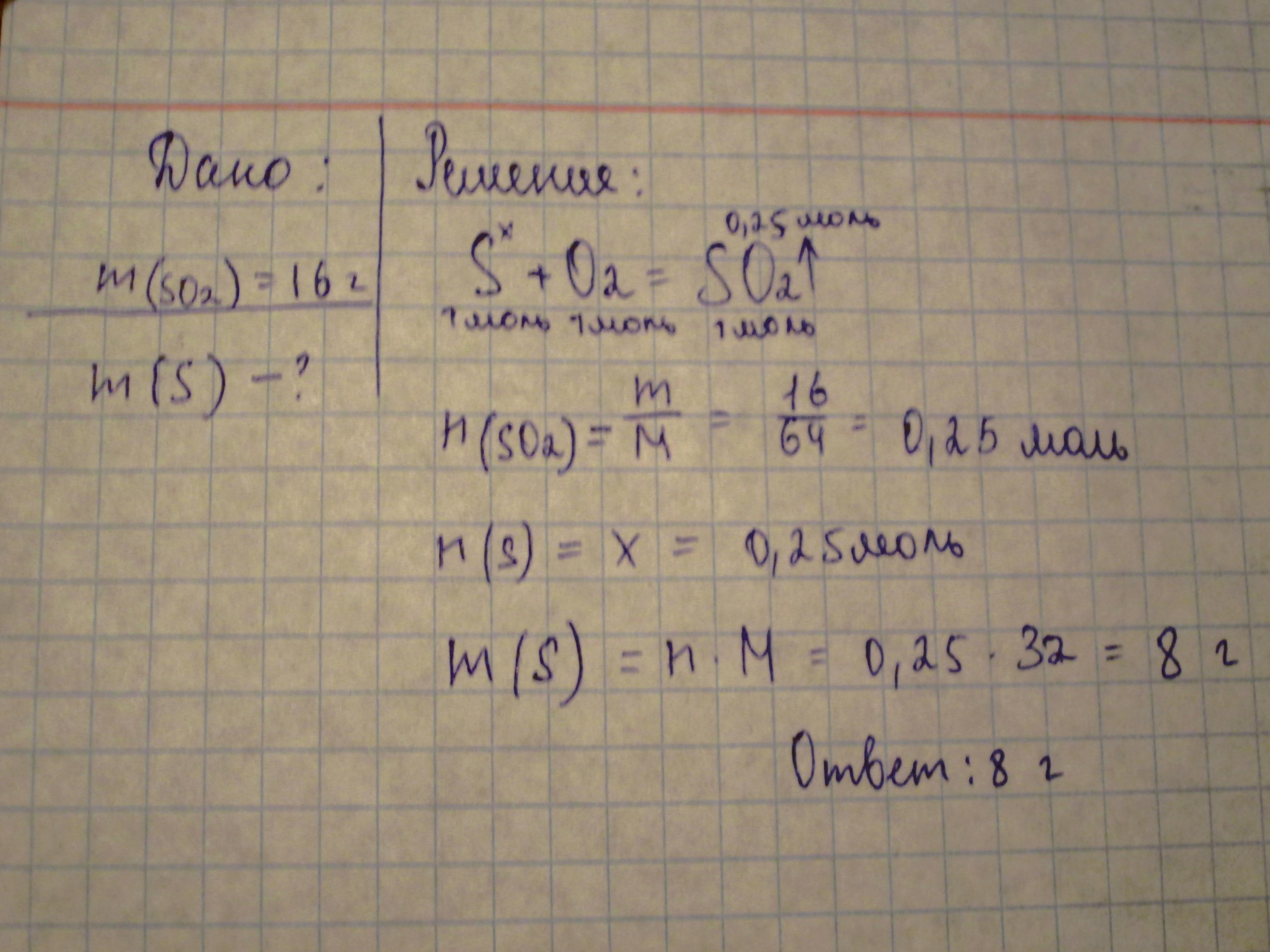 Сколько грамм серы необходимо взять для горения если в результате образуется 16г сернистого газа?