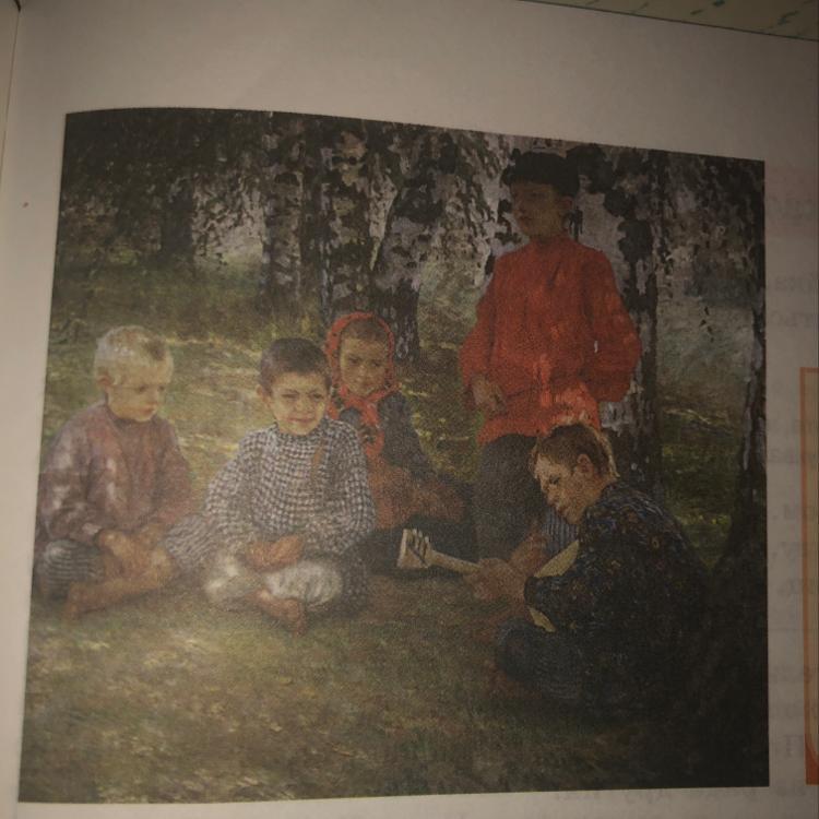 Мальчик по имени Ваня играет на балалайке ,а все остальные его внимательно слушают.Некоторые пытаются ему даже подпеть.Автор данной картины пытался передать свой характер,стиль через цветовую гамму.Все деревья,природа светлых тонов,зеленая трава на опушке,все это придает настроение картине.