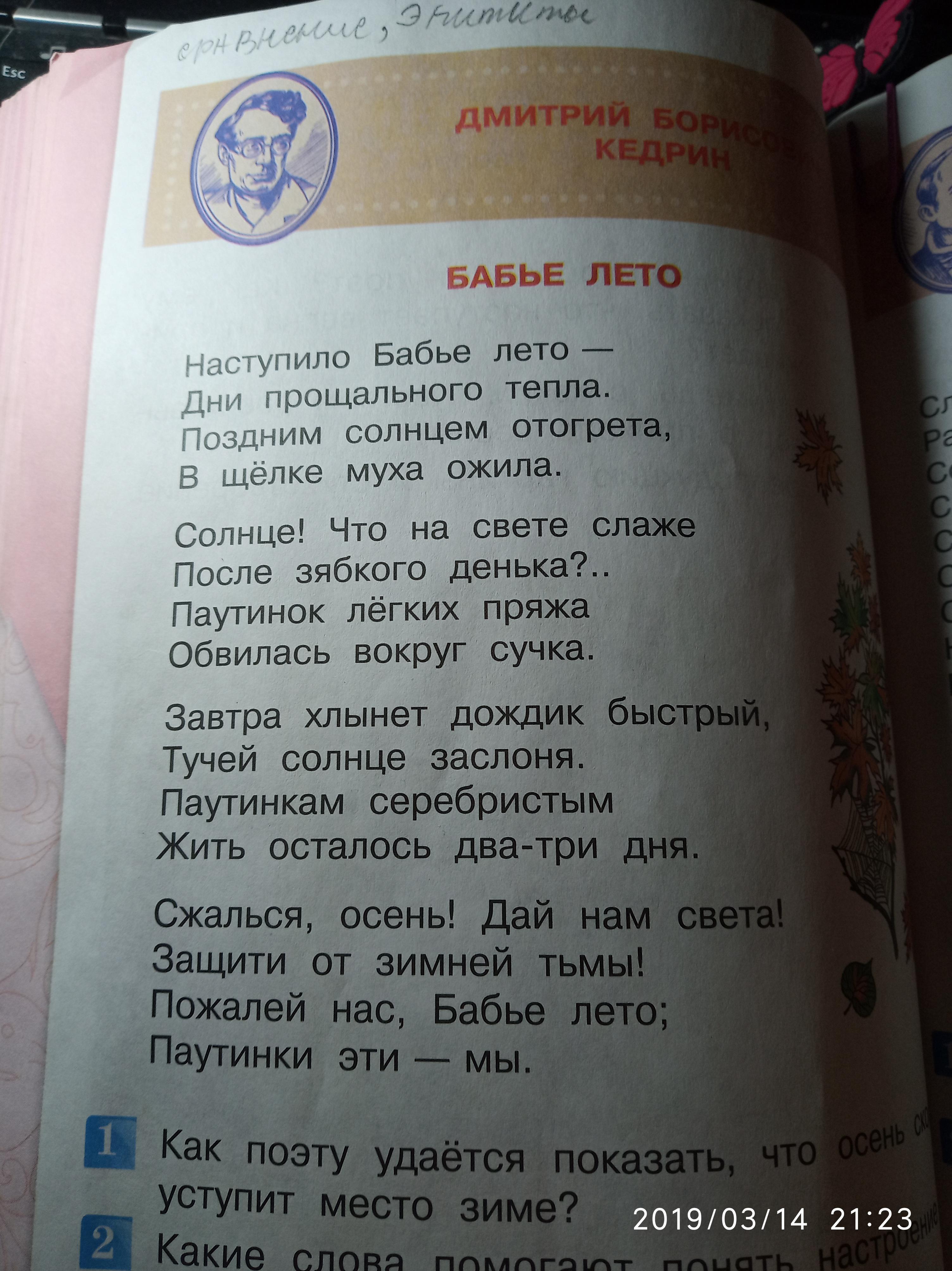 Эпитеты:бабье лето, прощального тепла, поздним солнцем, зябкого денька, паутинок легких, дождик быстрый, паутинкам серебристым, зимней тьмы.