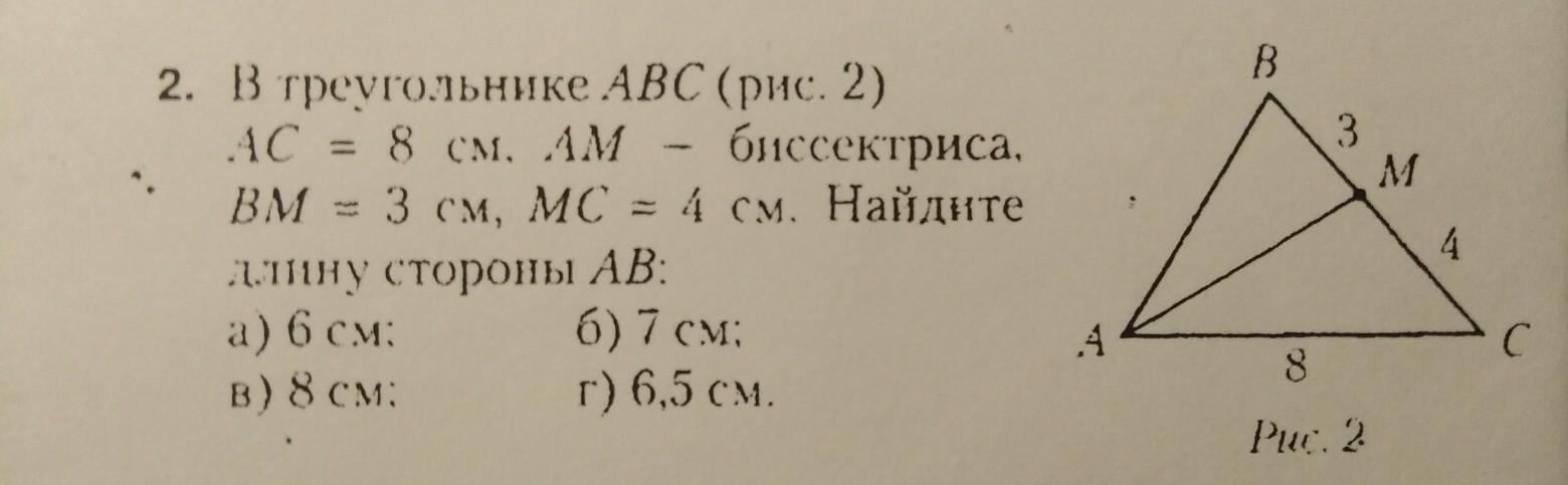 В треугольнике ABC (рисунок 2) AC равно 8 см AM-биссектриса. BM равно 3 см, BC равно 4 см. Найдите длину стороны AB.
