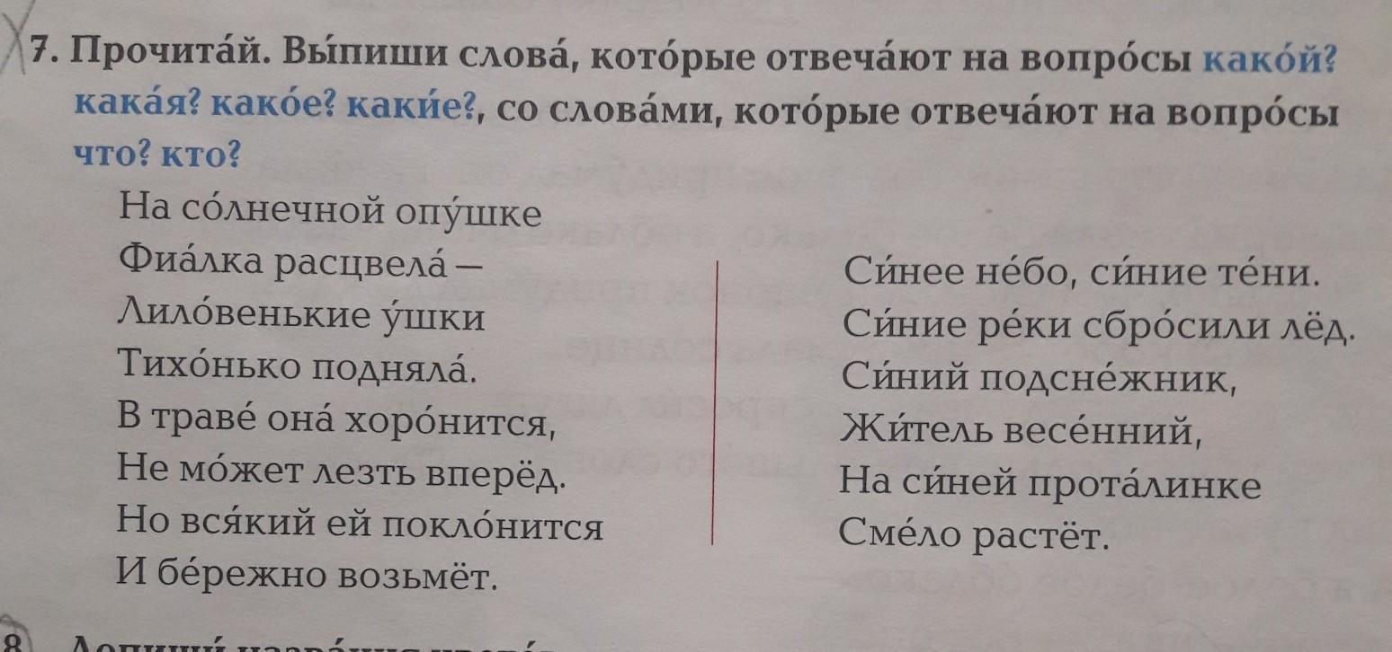 по моему, лиловенькие ушки, синее небо, синие тени, синие реки, синий подснежник, житель весенний. Почему так, потому что лиловенькие, синее и т.д отвечают на вопросы какой? какая? какие? и.тд, а слова житель, небо, тени это вопрос "что?"