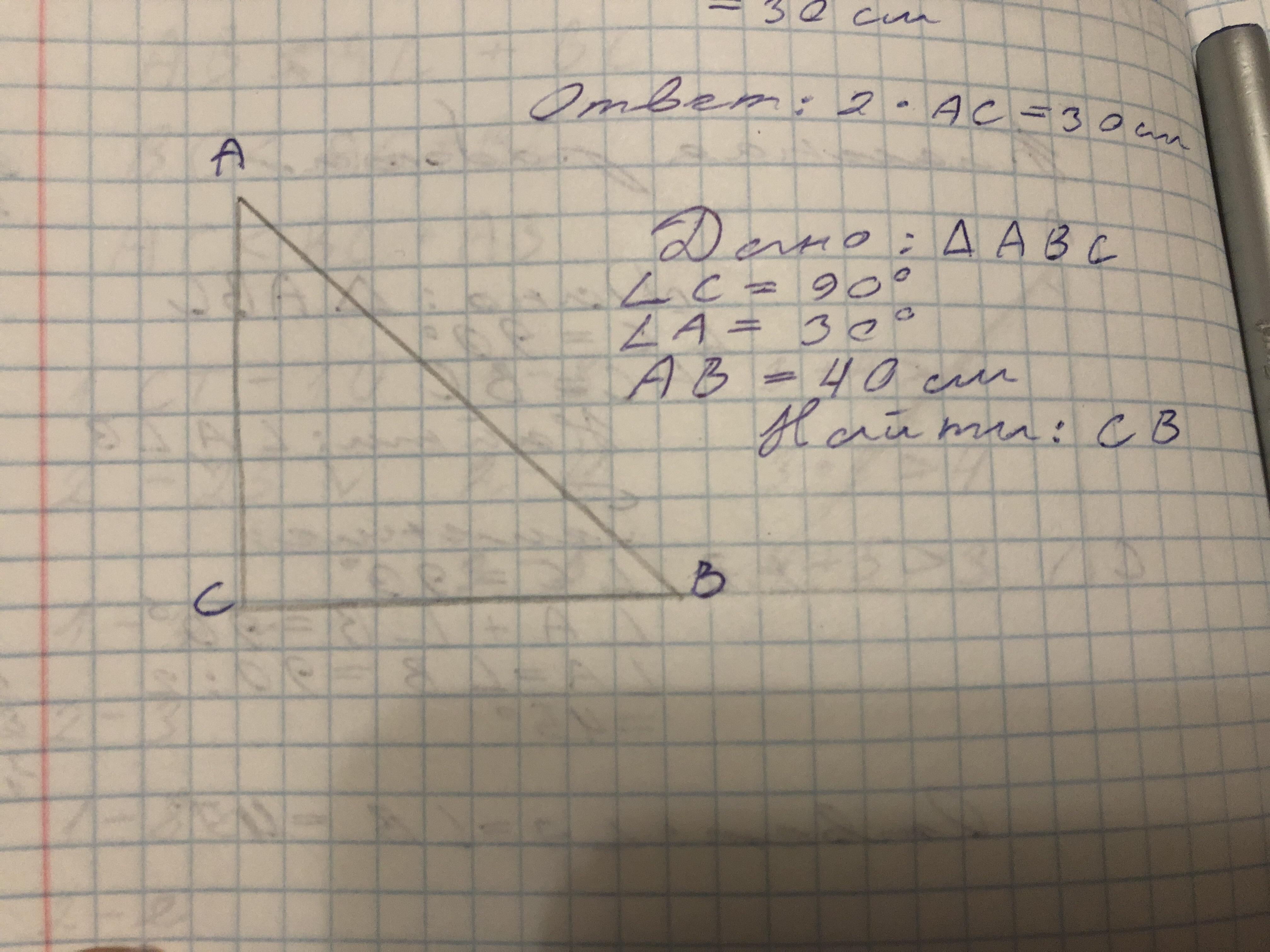 Так как сторона ВС лежит напротив угла 30 градусов, то она равна половине гипотенузы. Значит АВ:2=40:2=20