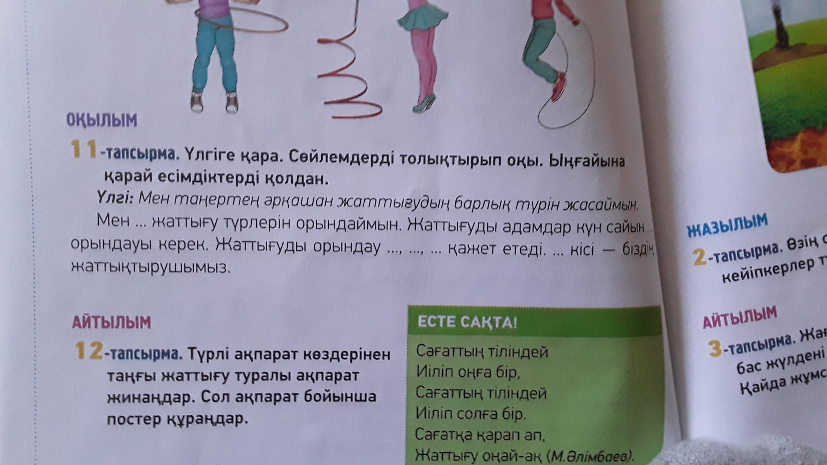 Мен əртүрлі жаттығу түрлерін орынлаймын.Жаттығуды адамдар күн сайын жақсы орындауы керек.Жаттығуды орындау ептілікті,мықтылықты,шаршамауды қажет етеді.Мына кісі - біздің жаттықтырушымыз