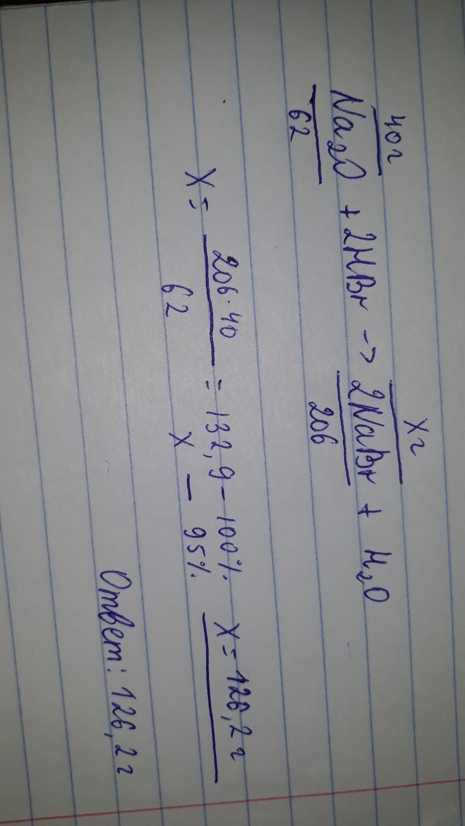 40 г оксида натрия обработали раствором бромоводородной кислоты. Рассчитайте массу образовавшейся соли, если практический выход в реакции составил 95%.