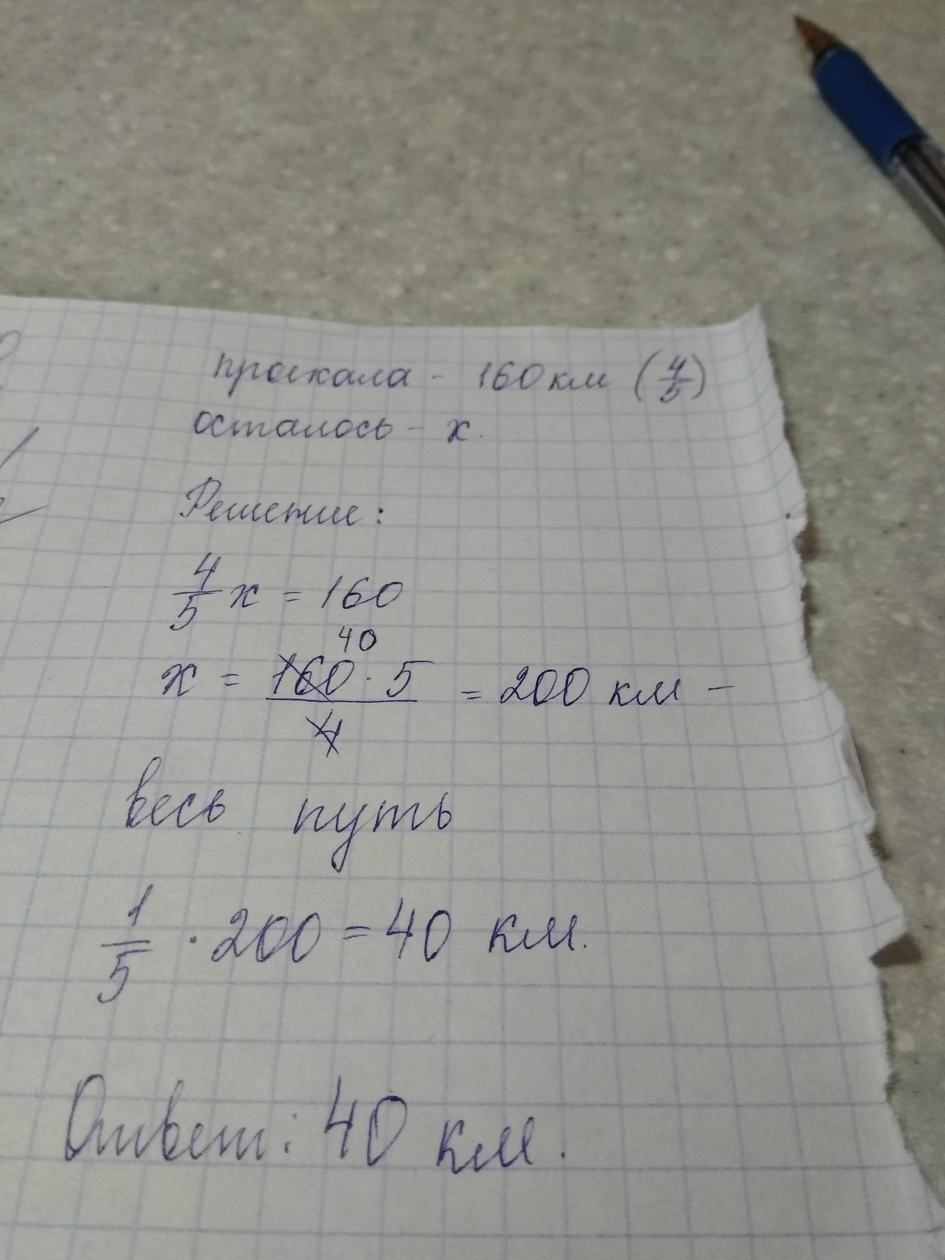 Машина проехала 160 км, что составляет 4/5 от длины всего пути . Сколько км ей осталось проехать?