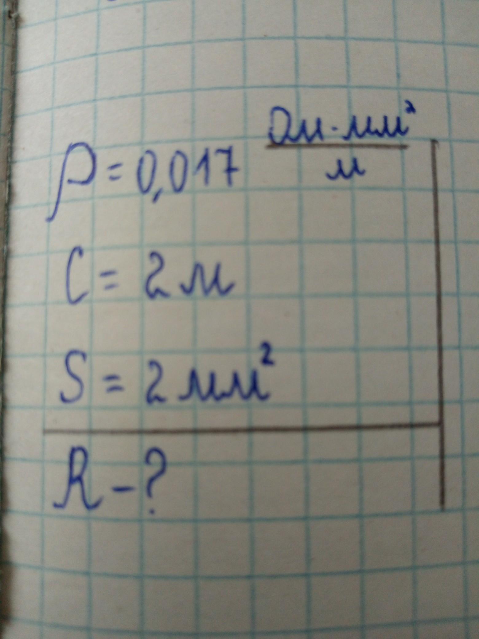 R=p*l/S=0,017*2/2=0,017 (Ом).