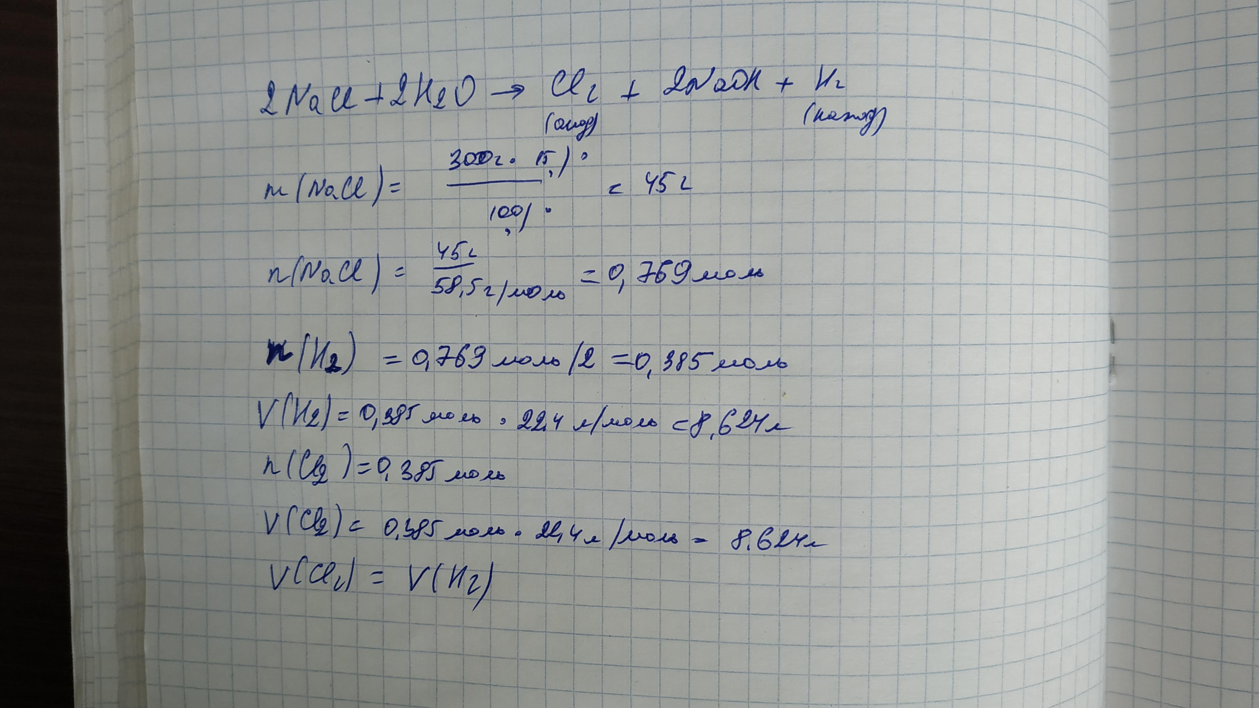 Помогите решить пожалуйста,очень нужно!!! при электролизе 15% раствора хлорида натрия массой 300 г на катоде выделился газ.вычислите его обьем и сравните с обьемом гпза выделенного на аноде.составьте уравнения электролиза.проведите необходимые вычисления