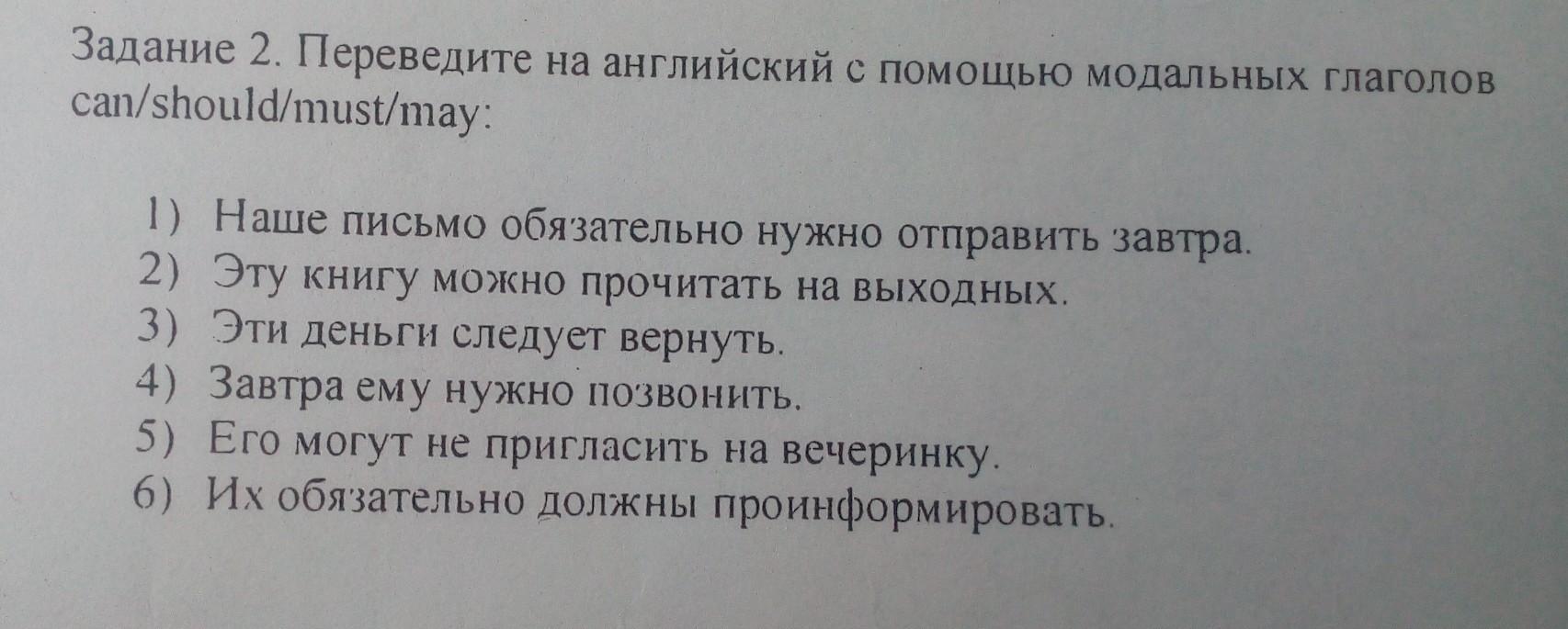 Our letter must be sent tomorrow.This book should be read at the weekend .this money should be returned.he needs to call tomorrow .he may not be invited to a party.They must be informed.